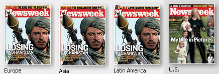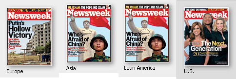 Via Unfogged and ThinkProgress, Newsweek’s current cover as it varies by geographical region: