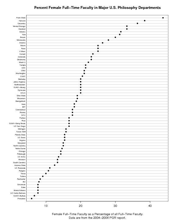 This is not, of course, a full sample of U.S. philosophy departments. Some things to notice: Penn State has the highest percentage of full-time women, at 43.75 percent. Princeton has the lowest, at about 5.9 percent. The median score is just shy of 18 percent. But while the maximum score is up in the mid-forties, only five departments (of sixty six) have a third or more full time women. Three quarters of all departments have 22 percent women or less.