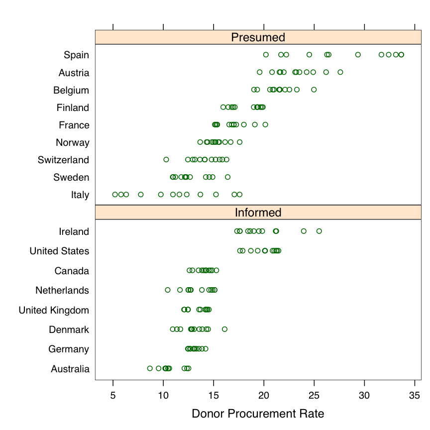 Johnson and Goldstein’s work on the role of default options in decision-making is good, but the figure above (especially with its y-axis labeled “Effective Consent Percentage”) is misleading as presented by Ariely. First he says, correctly, that the data show “the percentage of people, across different European countries, who are willing to donate their organs after they pass away.” But then he says, wrongly, that “similar countries have very different levels of organ donations.” The graph shows the number of people who say they are willing in principle to be donors, and the large difference that the default option to this question makes. The casual reader might think—as Ariely himself seems to—that the actual rate of organ procurement in those presumed-consent countries is vastly higher than that in informed-consent countries. But this is not the case at all. The figure shows is how many people sign up given the defaults (opt-in vs opt-out), and not the rate of actual organ donors procured.