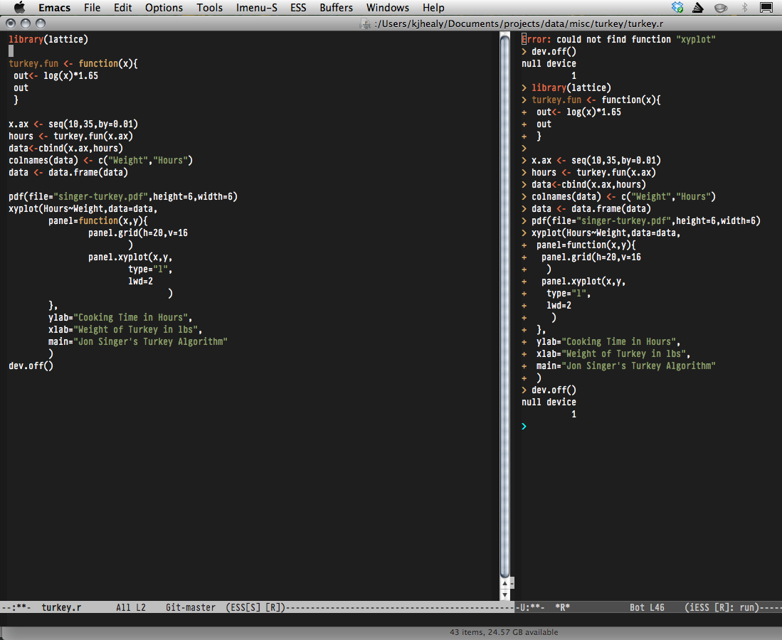 A Nightmare from which I am trying to Awake December 20, 2008 IT Misc Signs that things are very bad: Emacs 23 from CVS + ESS + Auctex, + a custom color theme. Brought back from the dead because while TextMate has many virtues, Emacs still, unfortunately, beats all-comers for coding with R.