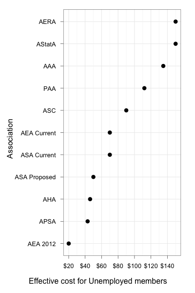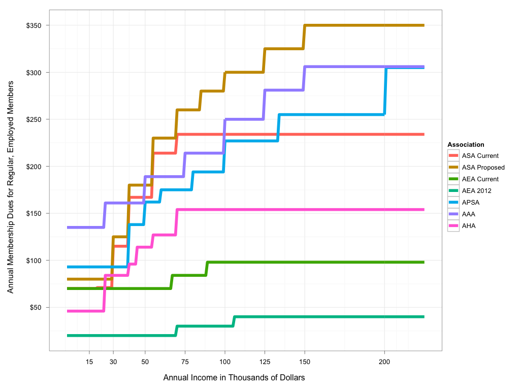 Not all of the ASA’s peer organizations have sliding scales: several simply charge a flat rate. Three relevant associations with flat-rate regular memberships, not included in the chart above, are the American Statistical Association (regular membership cost: $150), the Population Association of America ($112), and the American Society of Criminology ($90).