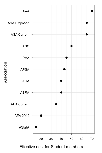 A number of people have been asking—or asserting—things about the relative cost of membership in the ASA as compared to peer organizations. This post provides some data about comparative membership costs and benefits.