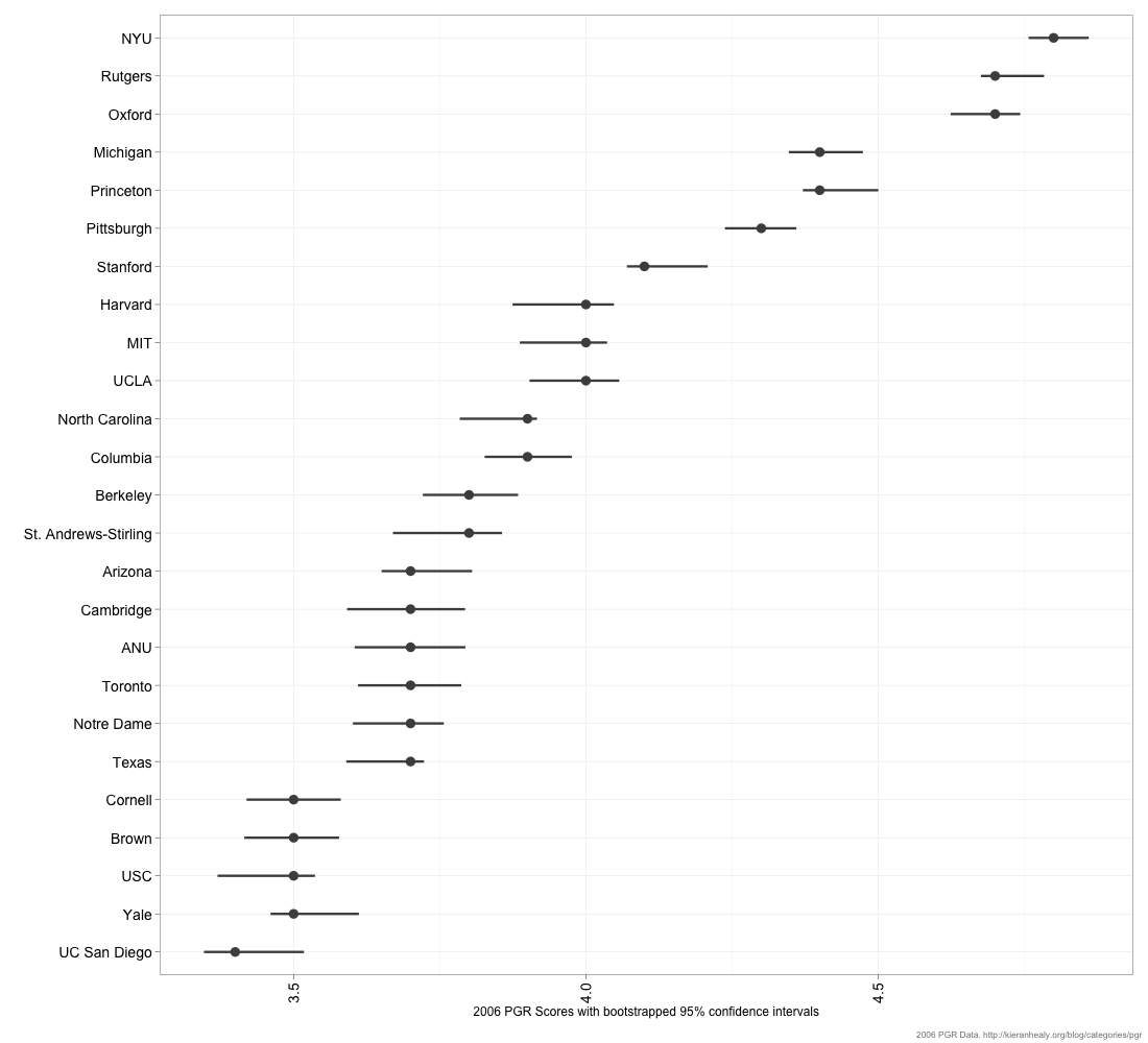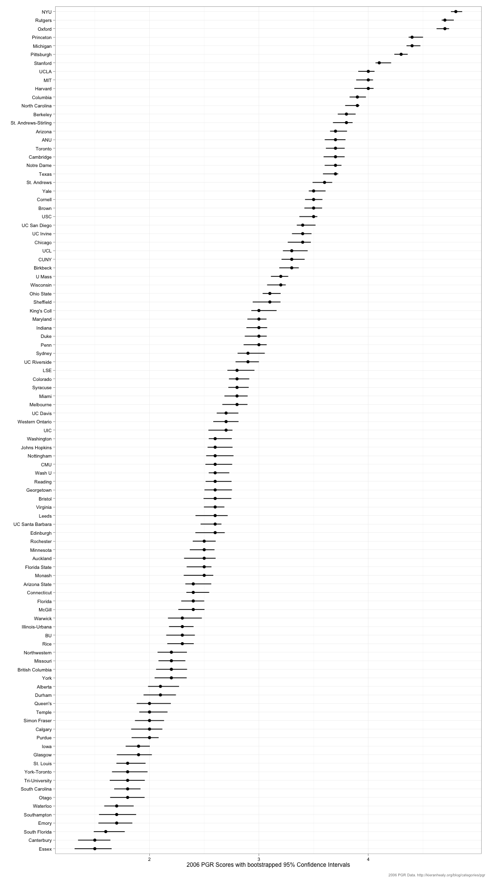 I come in peace. As Brian mentioned last week, I’m going to be guesting on his blog for the next few days. For those of you who don’t know me—which I imagine is most of you—I am a sociologist; I teach at Duke University both in my home department and the Kenan Institute for Ethics; and for the past nine years or so I’ve been a blogger at Crooked Timber. Initially, I was tempted to treat this gig in the way that people tend to treat philosophers they meet in bars—viz, aggressively tell you all what my philosophy is, perhaps make a truly original joke that comes with fries, or maybe sketch out my own interpretation of two-dimensionalism. (The latter is typical of certain sorts of bars only.) On mature reflection I decided against these options, promising though they were. Instead, I’ll mostly be telling you about some analysis I’ve done of the PGR. The data I’ll be relying on come partly from information available on the PGR website itself, and partly from rater-anonymized versions of the 2004 and 2006 waves provided to me by Professor Leiter. I presented some of this material last month at a panel at the Central APA meetings, and I have also presented it to various Sociology and (once or twice) Philosophy departments in the recent past. In my posts here I’ll begin by focusing on some of the questions that Philosophers tend to have about the data, but I also hope to get to some of the reasons for why the PGR is an interesting entity in comparison to many other efforts to rank departments or other entities in academia, and why ranking has become so common in recent years.