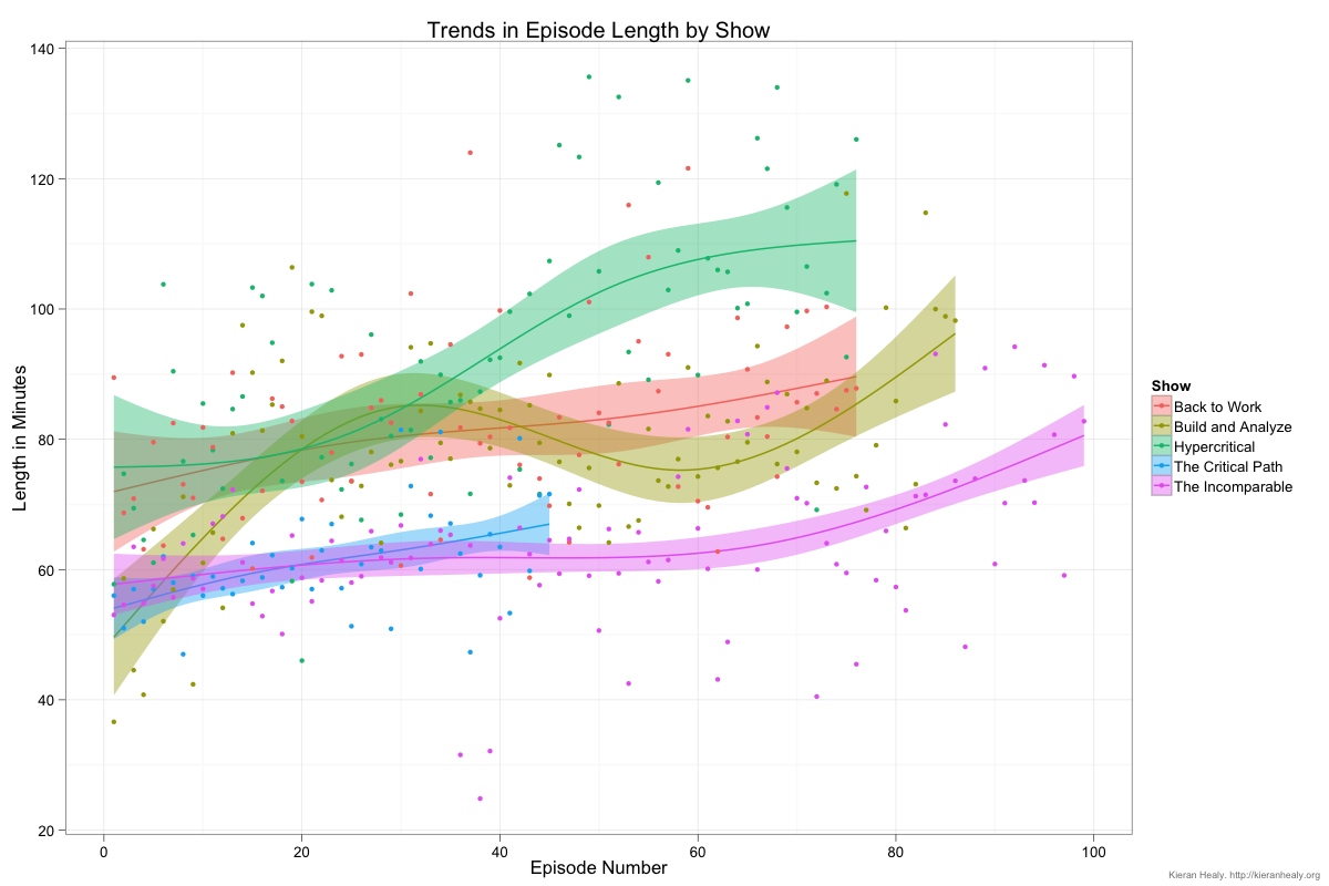 Thanks to a link from Marco Arment, the Talk Radio post got a lot of traffic. Following up on some twitter and email requests, here is some additional stuff. First, the data again, but with The Incomparable added:
