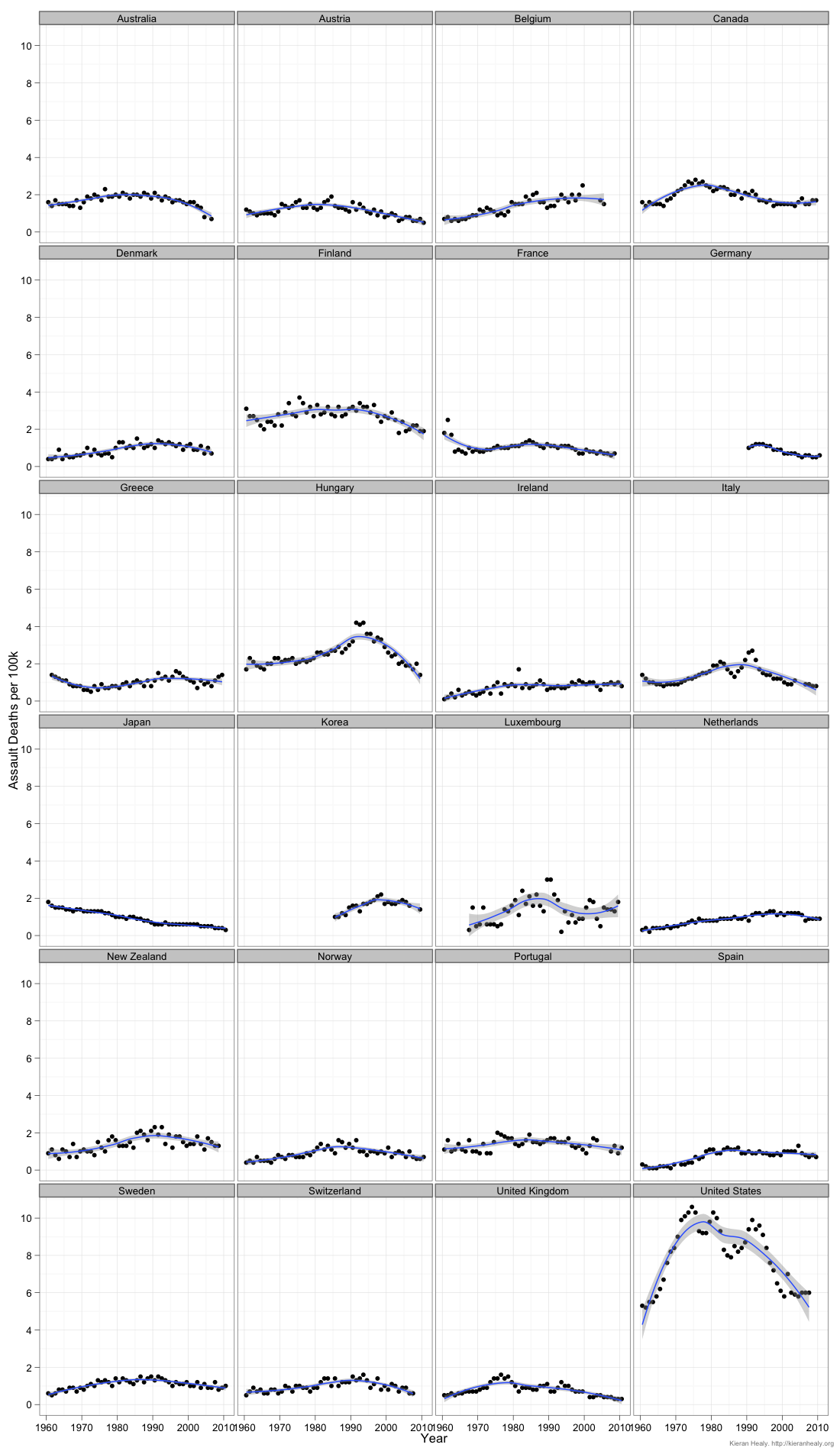 Update (October 2015). For an update including more recent data, see this post: Assault Death Rates, 1960-2013