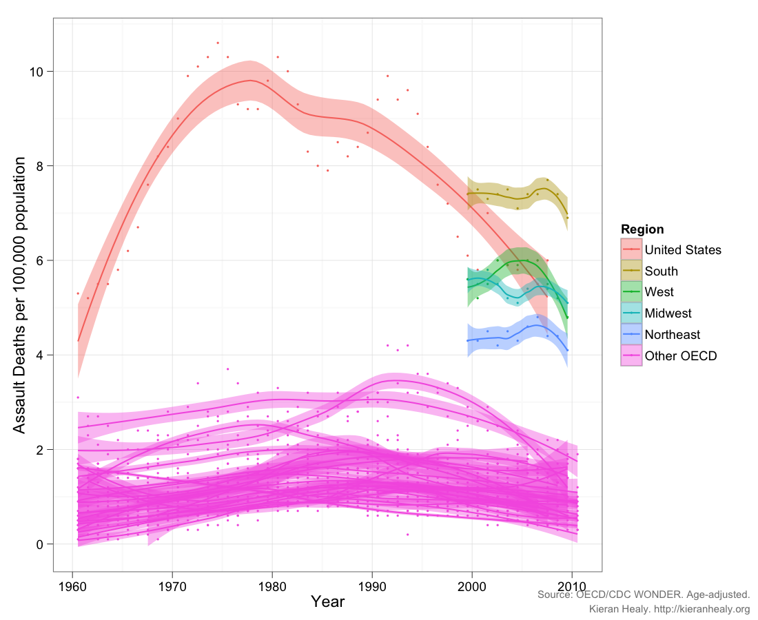 As is well known, the South is more violent than the rest of the country, by some distance. Given the earlier post, the natural thing to do is to put these regional trends into the cross-national comparison and see—for the decade we have, anyway—how these large U.S. regions would fare if they were OECD countries. Again, bear in mind that the age-adjustment is not quite comparable.
