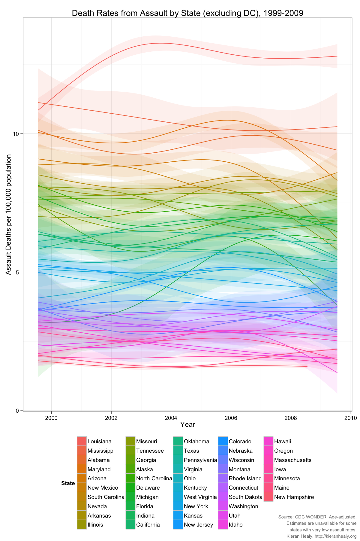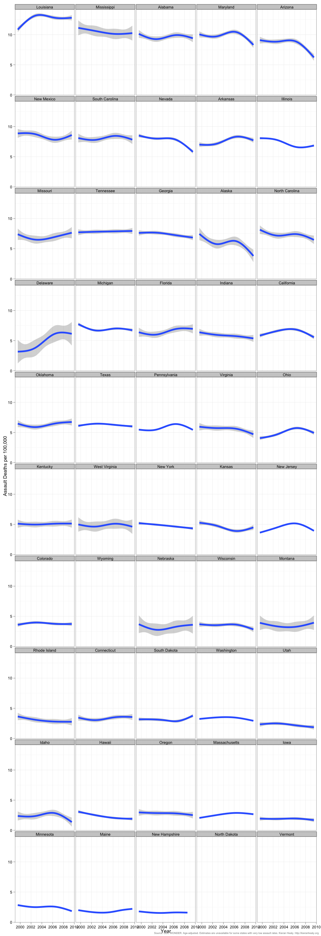 Yes, I know the perceptual qualities of this figure are, shall we say, not ideal. I had a fit of info-graphic-itis and couldn’t not show you it, because it looks so colorful. It does give you a sense of the range of variation and some of the regional banding. The figure excludes the District of Columbia, which has a much higher death rate but is also a city. Also missing are a few states with small populations and low absolute numbers of assault deaths—Wyoming, North Dakota, Vermont—such that the CDC can’t generate reliable age-adjusted estimates for them. If you want a “small-multiple” view with each state’s time-series shown separately from high to low, here you go.