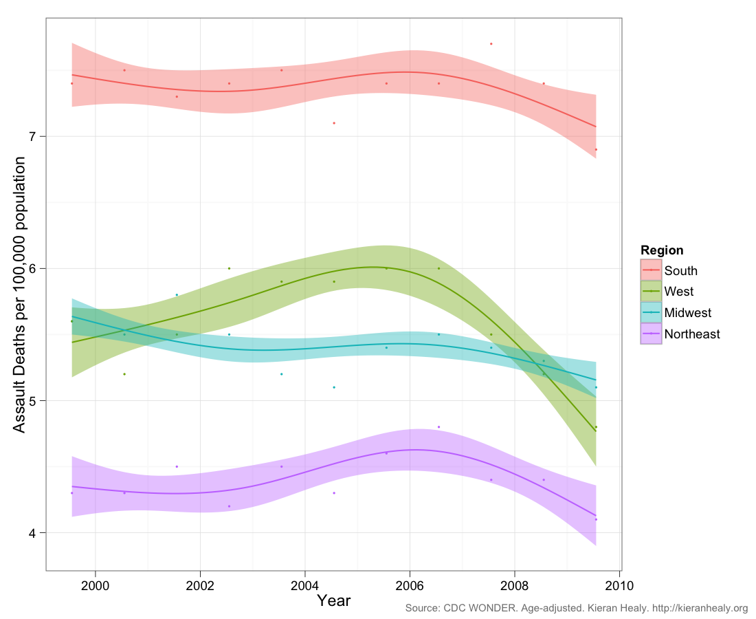 Trends in the Death Rate from Assault, 1999–2009, by Region. Click for a larger PNG or PDF.