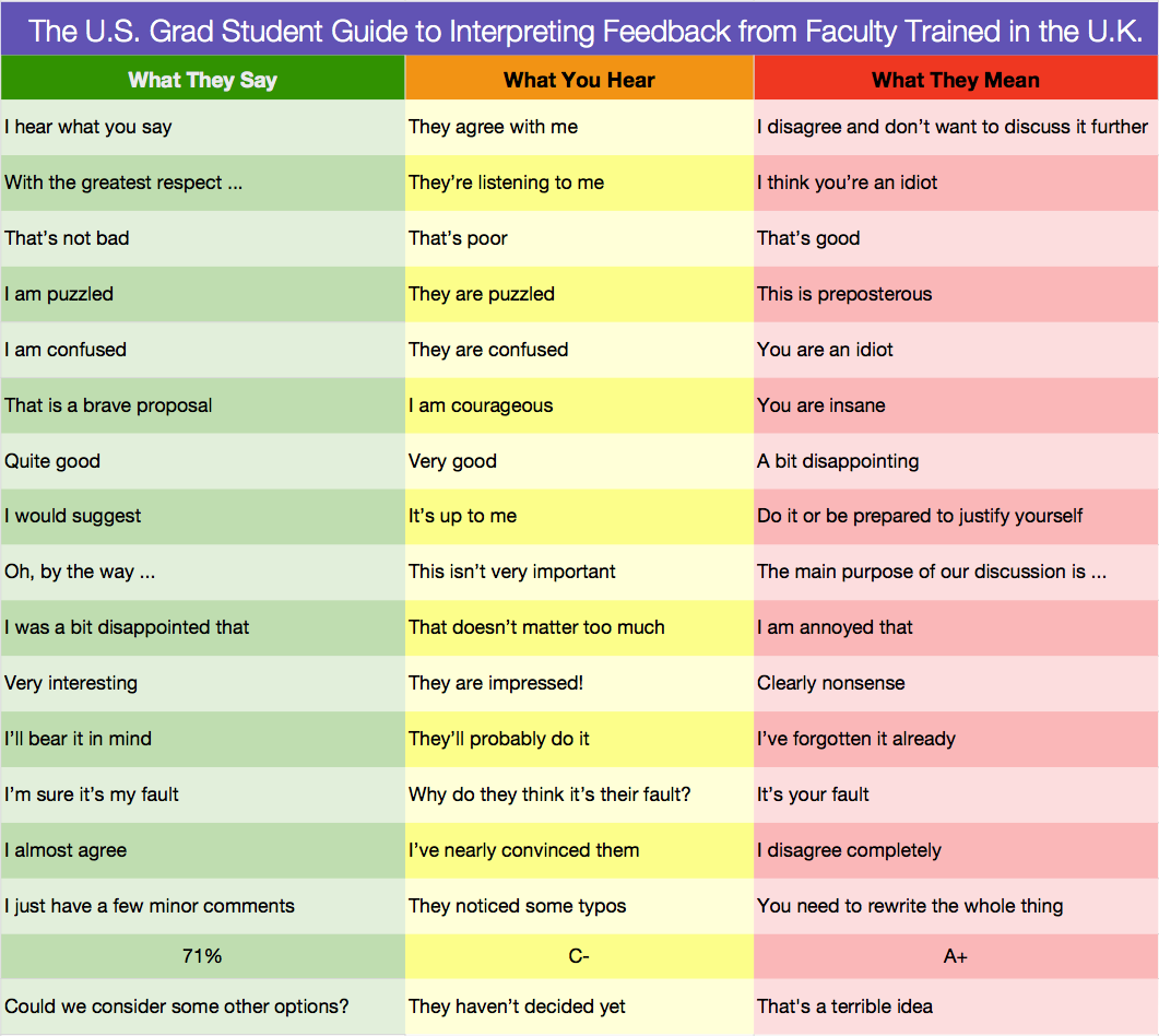 What they say, what you hear. People have been circulating this–e.g., on Metafilter–so here’s a permanent link. I wrote it as a followup of sorts to this guide to feedback from UK-trained academics.