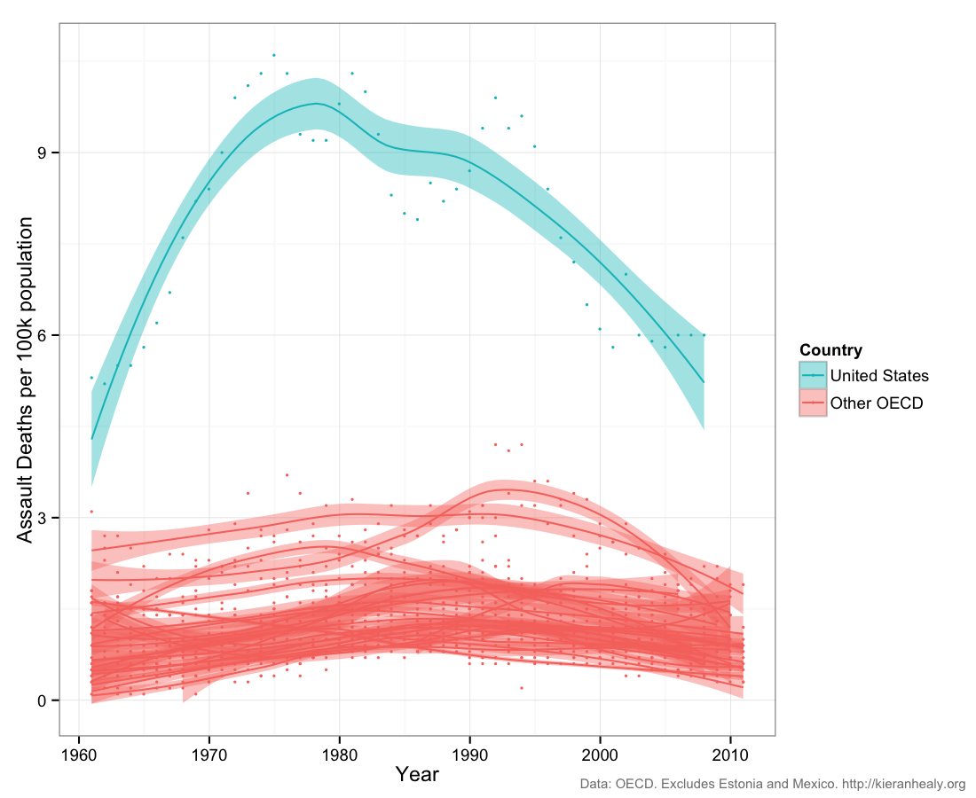 The problem across the board here is getting consistent, reliable, cross-national data. The goal of the original post was to set the U.S. in some kind of longitudinal context with broadly comparable countries—in brief, the advanced industrial democracies—and the OECD is the best source for time-series data of this kind. But there is no good long-run cross-national data on deaths due to gun-use alone. Death as a result of violent assault is the best available series. There are some single-year cross-country datasets, and there are some smaller country-to-country comparisons, too. As a reminder, my original posts did not make any claims at all about guns, gun violence, or gun laws. I was interested in comparing rates of violent death across developed democracies, and that’s exactly what I did.