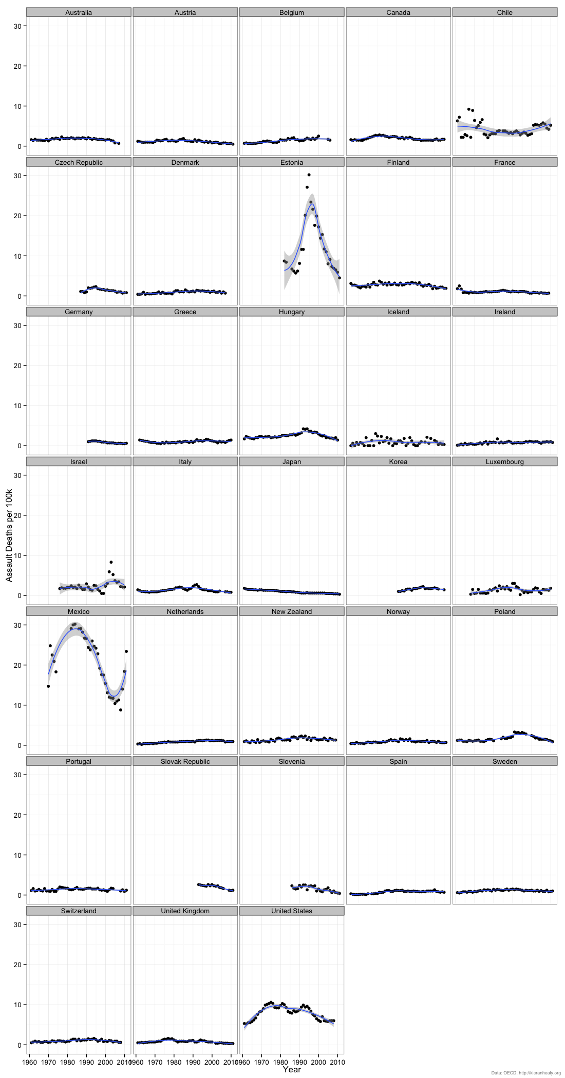 The original post (and the note attached to the figures) made it clear I excluded two OECD countries with higher assault death rates than the US: Estonia and Mexico. I also excluded some other OECD countries whose rates are lower than the US, again on the grounds of useful comparison. These were Chile, the Czech Republic, Israel, Poland, Slovakia, and Slovenia. Here is what the figure looks like with all of these countries included: