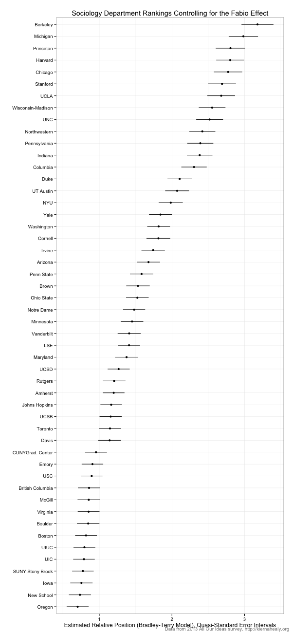 When I posted the Sociology Department Rankings for 2013 I joked that Indiana made it to the Top 10 “due solely to Fabio mobilizing a team of role-playing enthusiasts to relentlessly vote in the survey. (This is speculation on my part.)” Well, some further work with the dataset on the bus this morning suggests that the Fabio Effect is something to be reckoned with after all.