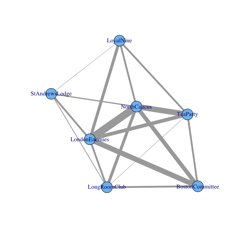 The analysis in this report is based on information gathered by our field agent Mr David Hackett Fischer and published in an Appendix to his lengthy report to the government. As you may be aware, Mr Fischer is an expert and respected field Agent with a broad and deep knowledge of the colonies. I, on the other hand, have made my way from Ireland with just a little quantitative training—I placed several hundred rungs below the Senior Wrangler during my time at Cambridge—and I am presently employed as a junior analytical scribe at ye olde National Security Administration. Sorry, I mean the Royal Security Administration. And I should emphasize again that I know nothing of current affairs in the colonies. However, our current Eighteenth Century beta of PRISM has been used to collect and analyze information on more than two hundred and sixty persons (of varying degrees of suspicion) belonging variously to seven different organizations in the Boston area.