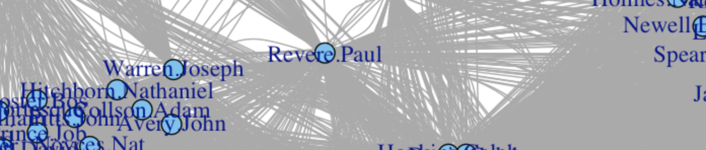 What a nice picture! The analytical engine has arranged everyone neatly, picking out clusters of individuals and also showing both peripheral individuals and—more intriguingly—people who seem to bridge various groups in ways that might perhaps be relevant to national security. Look at that person right in the middle there. Zoom in if you wish. He seems to bridge several groups in an unusual (though perhaps not unique) way. His name is Paul Revere.