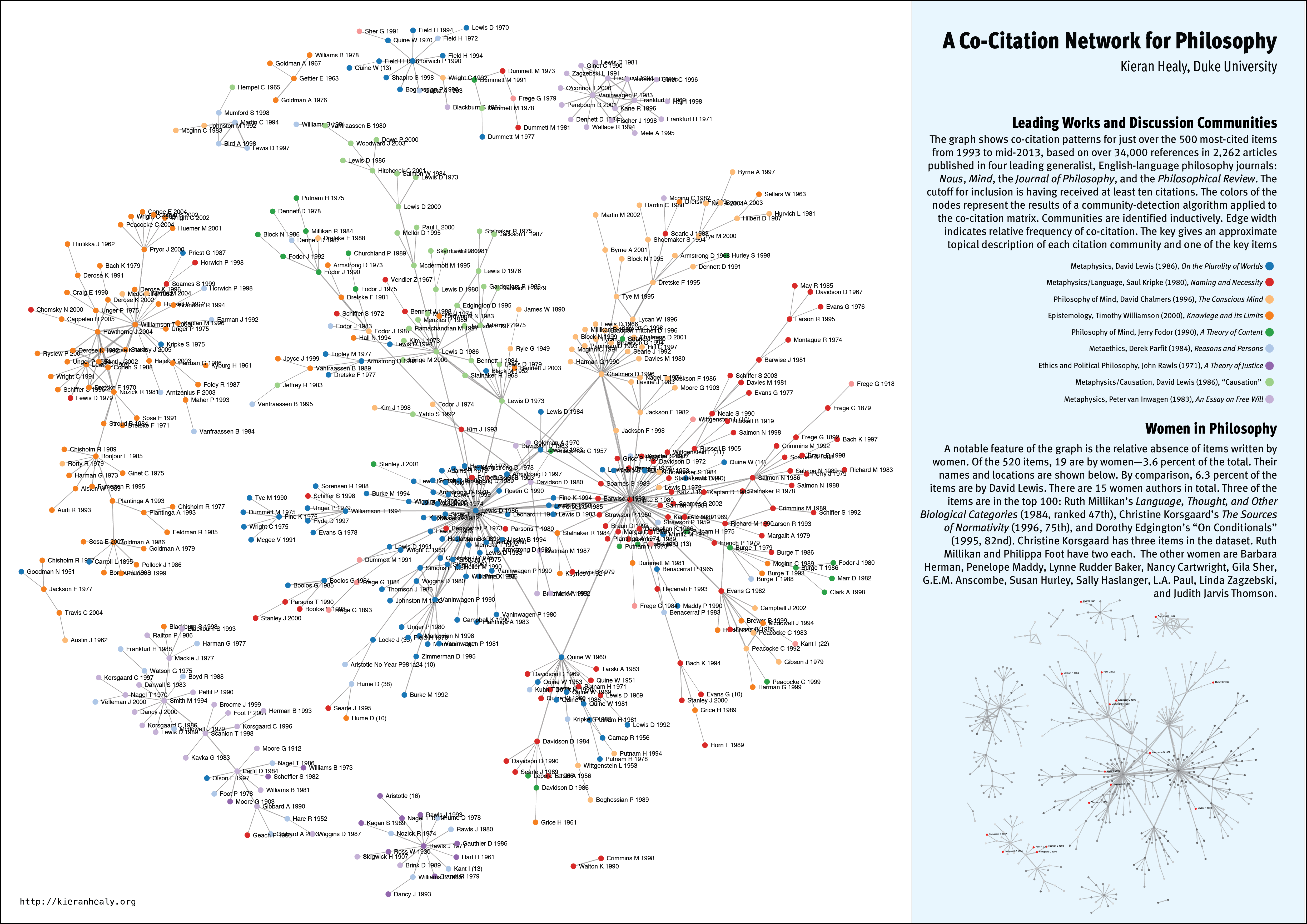 Last week’s posts on A Co-Citation Network for Philosophy and Lewis and the Women generated a fair amount of discussion amongst philosophers, and I also got quite a few emails. I want to thank the philosophers who emailed me corrections or spotted duplicates in the item list. I will continue to fix minor errors along these lines. A few people asked whether it would be possible to have a poster-like presentation of the data. Here it is as a PDF file suitable for printing. There is a PNG version as well.