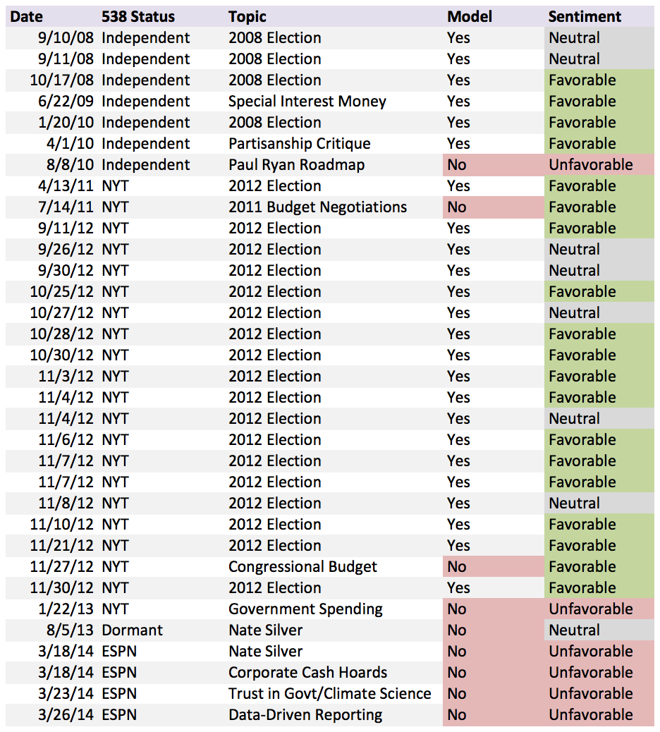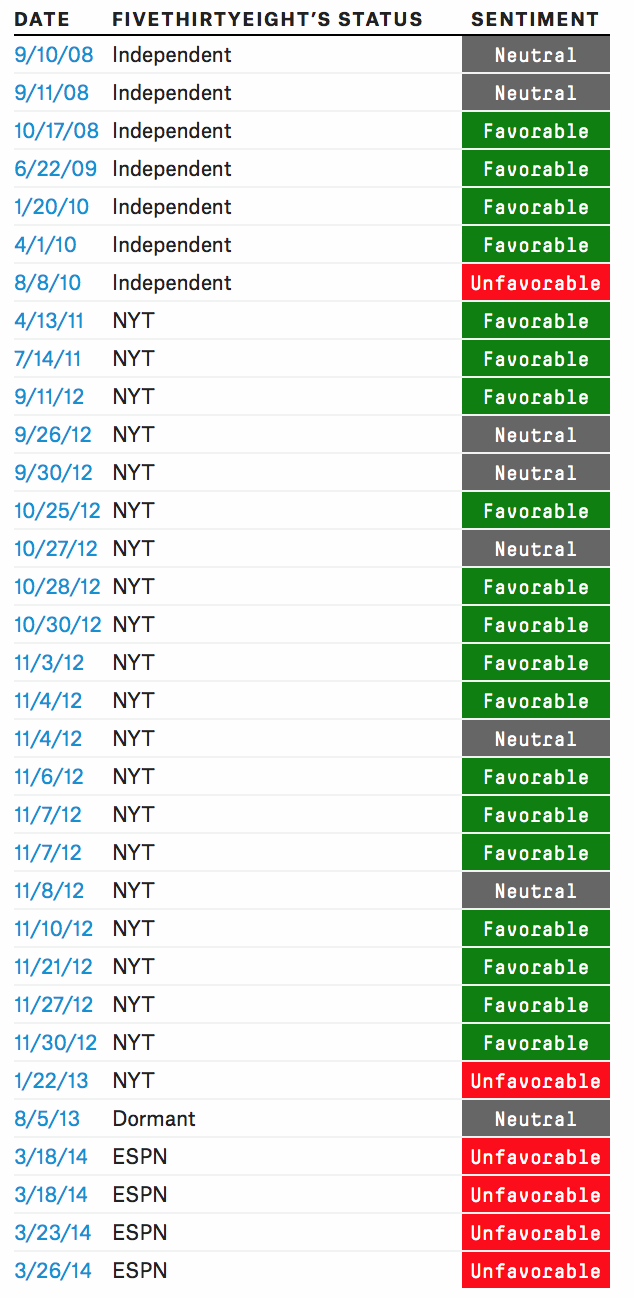 [Krugman] has expressed substantially more negative sentiments about FiveThirtyEight since it left The New York Times, according to a FiveThirtyEight analysis. … [Krugman] has referred to FiveThirtyEight or editor-in-chief Nate Silver 33 times on his blog. FiveThirtyEight classified each reference based on whether it expressed a favorable, unfavorable or neutral sentiment toward FiveThirtyEight. … Mr. Krugman referred to FiveThirtyEight or Nate Silver on seven occasions during its independent period. Four of these mentions were favorable, two were neutral, and one was unfavorable. … During FiveThirtyEight’s tenure with The New York Times, Mr. Krugman referred to FiveThirtyEight or to Nate Silver 21 times. Over all, 15 of these references were favorable, as compared to five neutral references and one unfavorable one. … But Mr. Krugman’s views of FiveThirtyEight have changed since it re-launched March 17 under the auspices of ESPN. The columnist has mentioned FiveThirtyEight four times in just nine days, all in negative contexts.