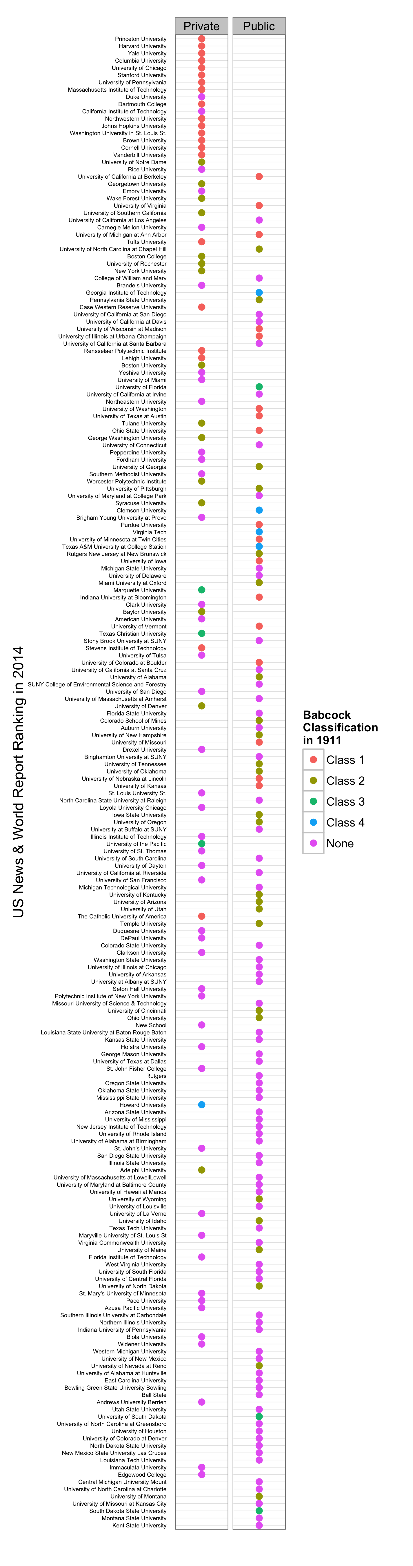 Here is a dotplot of the 2014 USNWR National University Ranking, where the dots are color-coded for Babcock Class. There are two panels, one on the left for Private Universities, and one on the right for Public Universities. USNWR’s highest-ranked school at the moment is Princeton, and it is at the top of the dotplot. You read down the ranking from there.