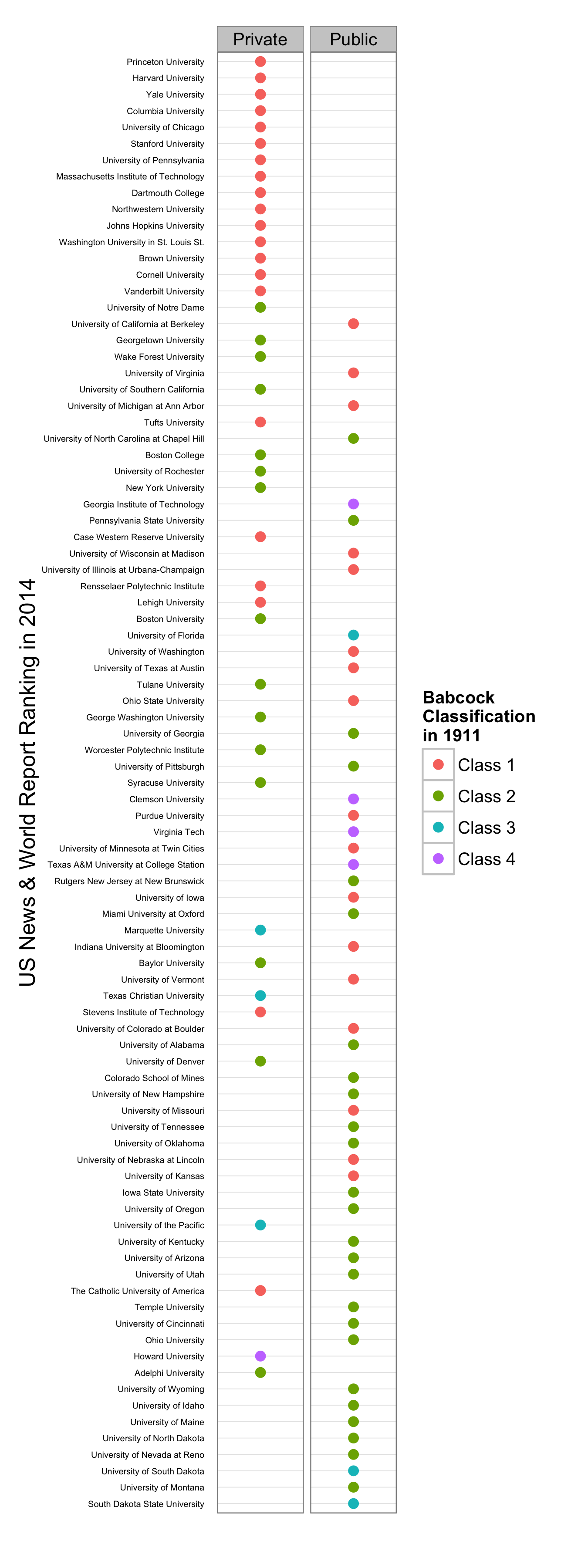 As you can see, for private universities, especially, the 1911 Babcock Classification tracks prestige in 2014 very well indeed. The top fifteen or so USNWR Universities that were around in 1911 were regarded as Class 1 by Babcock. Class 2 Privates and a few Class 1 stragglers make up the next chunk of the list. The only serious outliers are the Stevens Institute of Technology and the Catholic University of America.