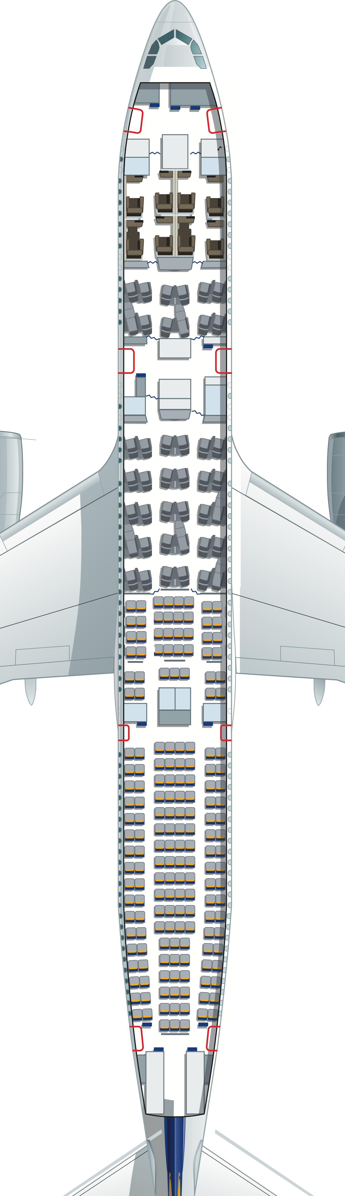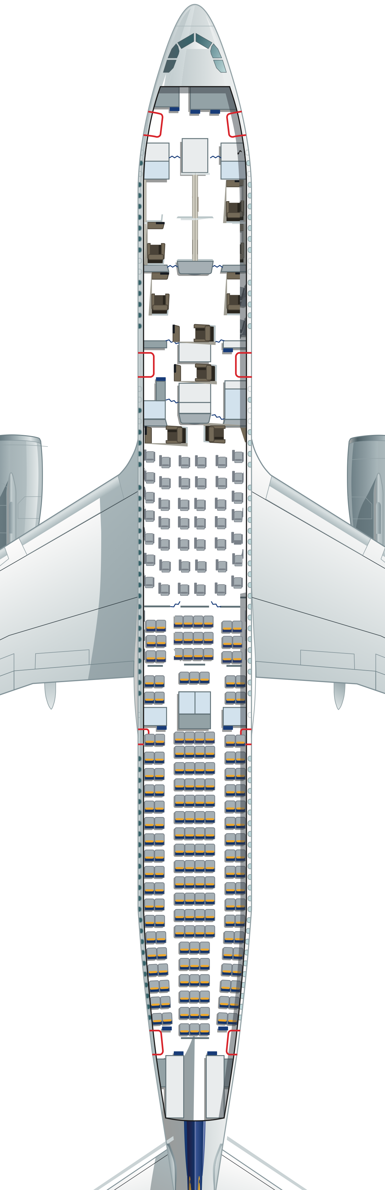 She also noted in passing that, as unequal as that is, it’s “still nowhere near the inequality of the U.S., or the world.” I found myself wondering what a plane with seating laid out on the basis of the U.S. income distribution would look like. So, following Beth’s lead, I decided to get into the aviation business and launch Air Gini, America’s most American airline. To begin, for context, here’s a regular old Airbus A330-300 in a three class configuration often seen on international flights. It has First, Business, and Economy Class cabins.