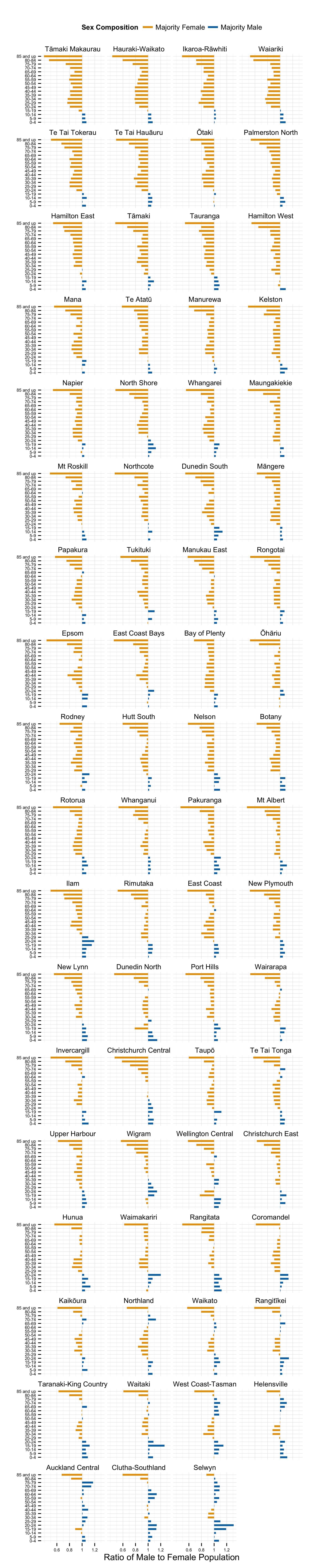 Sex Ratios by 5-year age cohorts in New Zealand Constituencies.