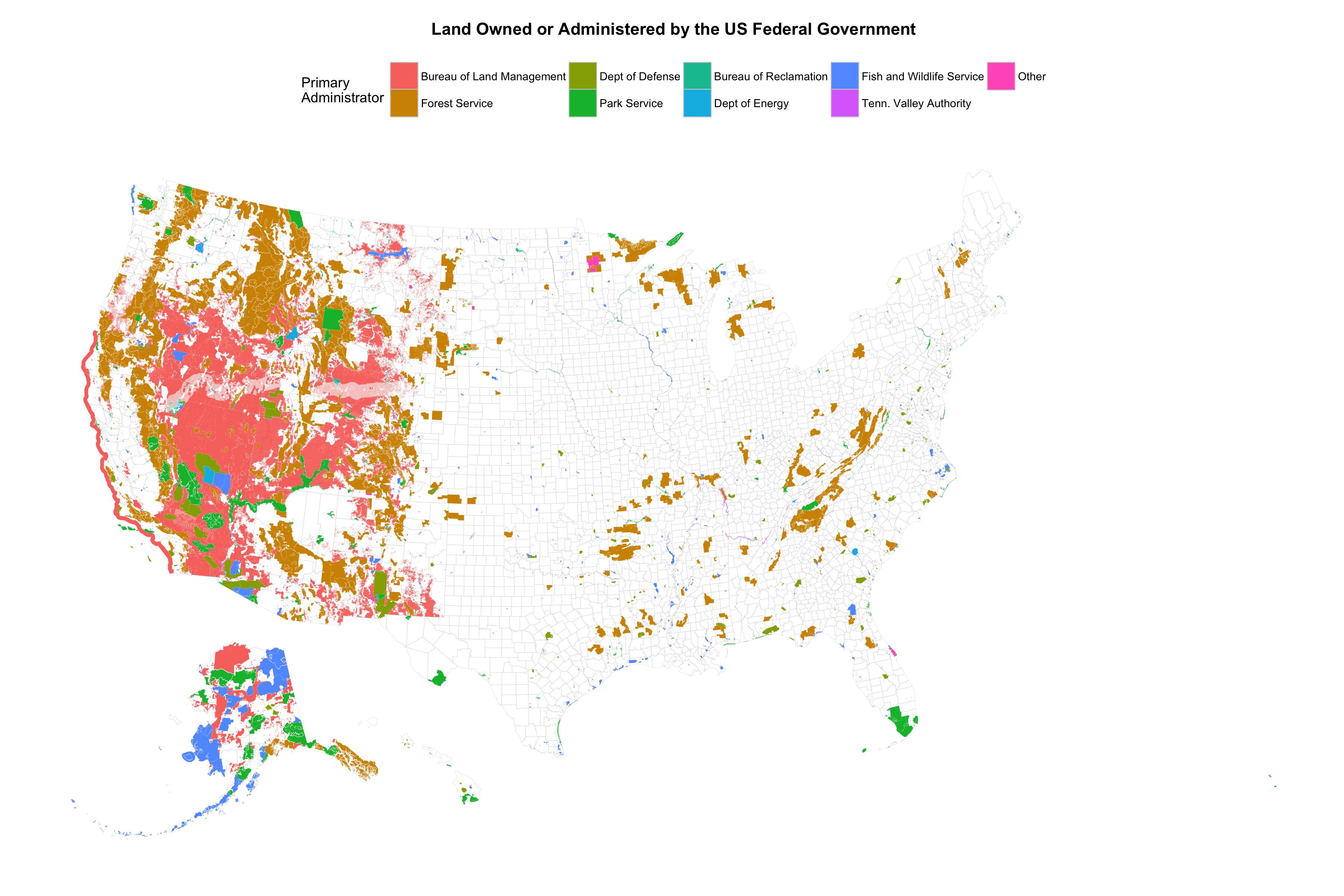 Alternatively, we can label the land categories not by use type but rather by the federal agency primarily responsible for them. Here is what that looks like. Again, we collapse some categories for agencies controlling relatively small areas.