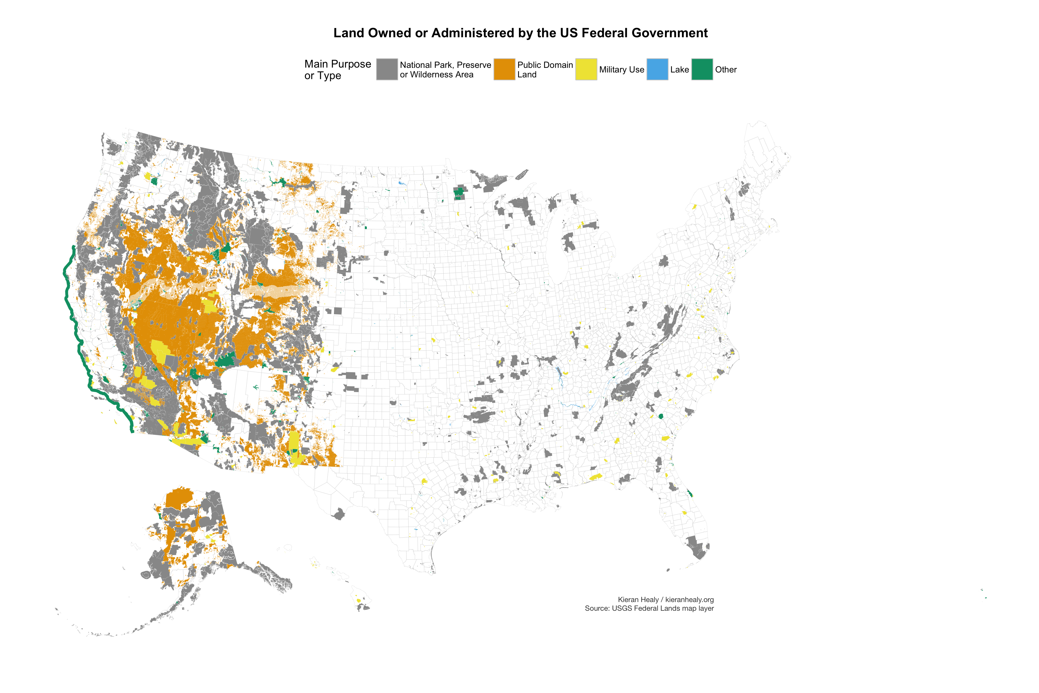 It’d be a nice exercise, I think, to produce a standard map of something like the US Election results, where you see swathes of a single color in very sparsely-populated areas, but then overlay it with the Federal Lands map in way that treated those areas as something like inland seas in the manner of the Great Lakes.