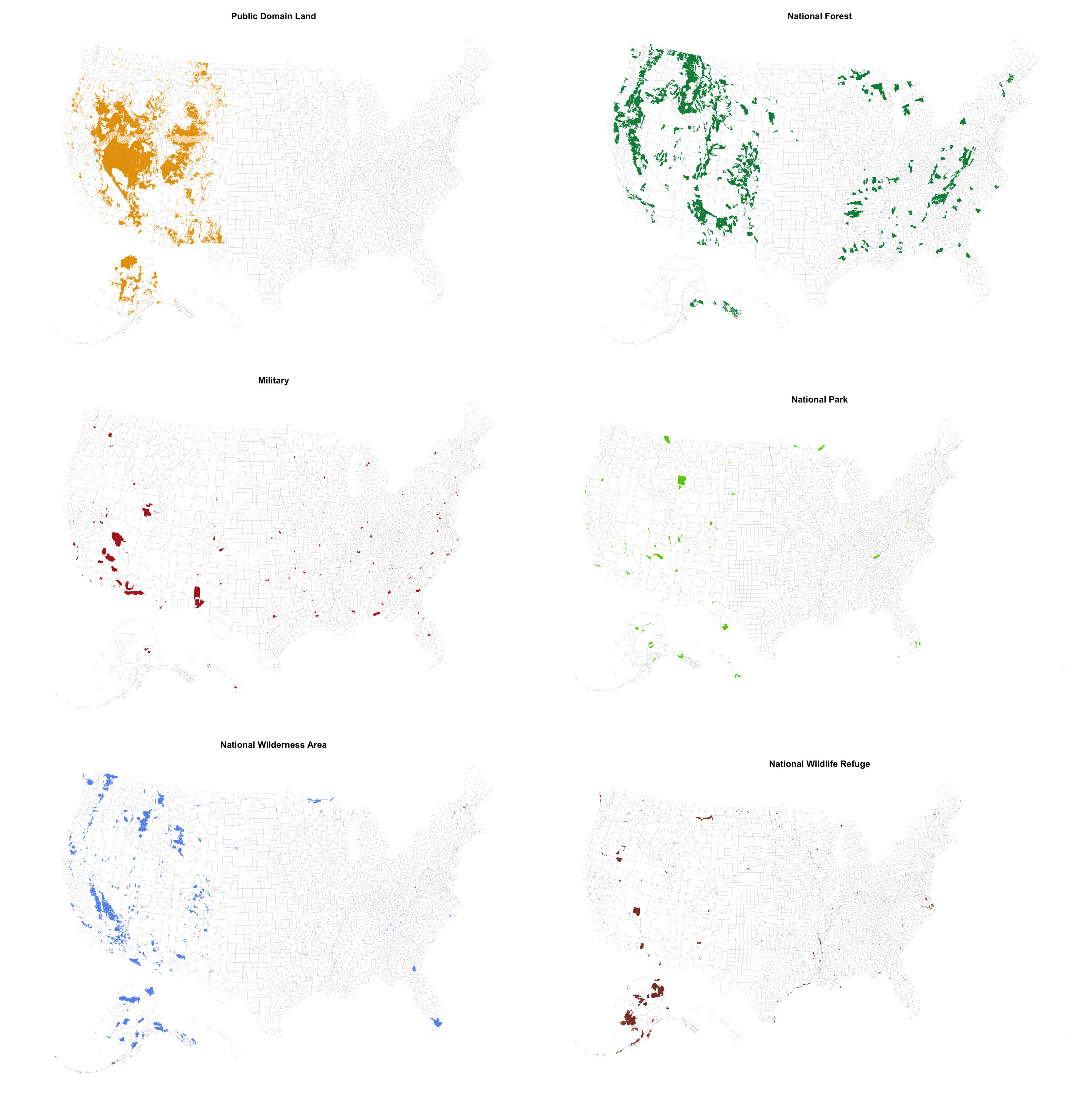 This map collapses a larger number of use categories to make it easier to see the main patterns. There are a couple of other ways one could look at it. First, we can break out the categories one at a time, like this. This might matter to us, for example, because the economic status of National Forest is different from that of a National Park or a National Wildlife Refuge. Here’s what some of those single uses look like.