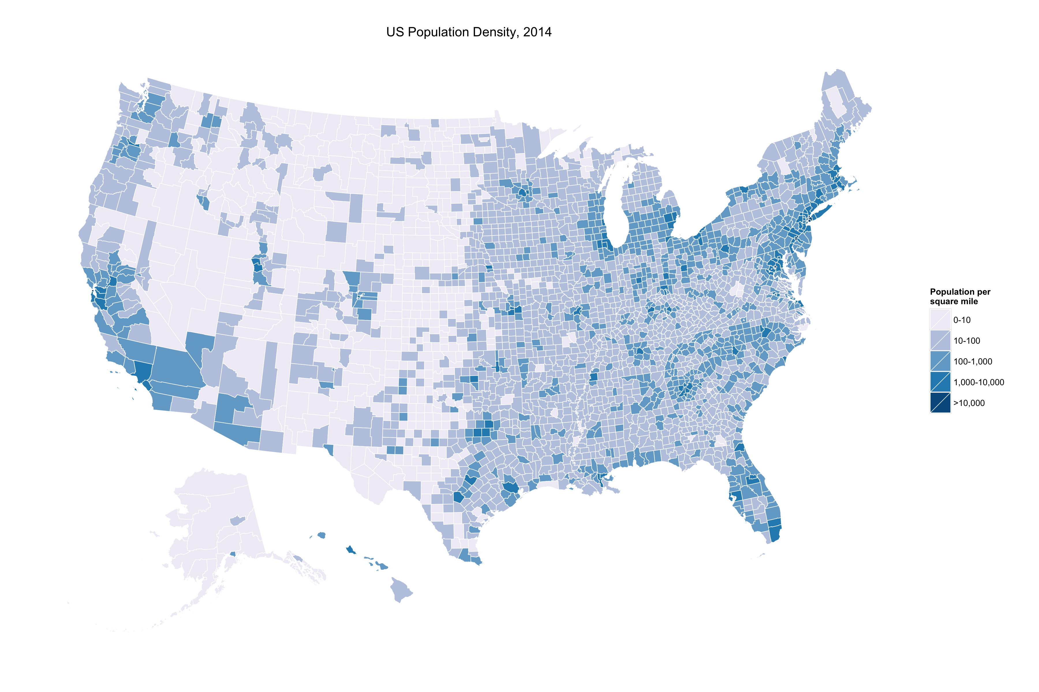 US Population Density Estimates, by county, 2014. Source: US Census.