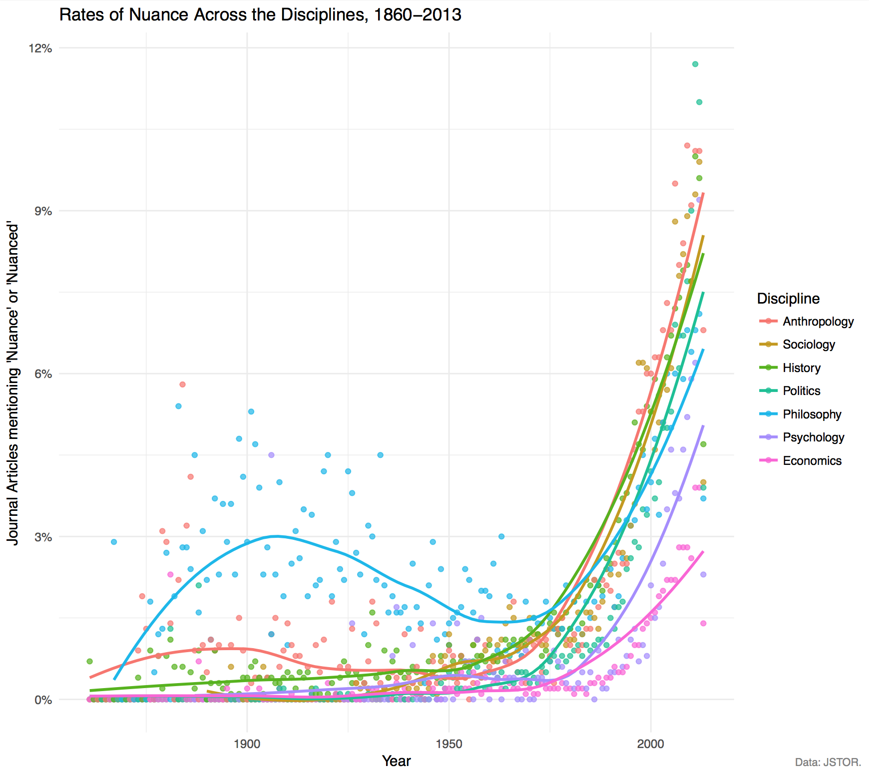 There are lots of suggestive patterns here. It would probably be wise not to lean on any of them too strongly. I do think that the overall patterns are picking up something real, and that people’s sense of the word “nuance” now being everywhere is not wrong. (The patterns for more generic terms of theoretical praise like “sophisticated” or “subtle” are much flatter.) At the level of entire fields—or the level of the whole of the social sciences—I’m tempted to see these trends as at least in part a manifestation of decreasing returns to Ph.D-level research in the context of a very large increase in the numbers of people doing and publishing academic work. Academic research is intrinsically specialized, and one must specialize within a literature or research program. Once that context is set, the more people who are working in that area, the less room there is for broad or wide contributions. It is much easier to make an incremental contribution that adds a wrinkle or an additional caveat to an existing approach or finding. In the paper I argue that there’s nothing wrong with that as such. After all, refining results and ideas is one of the main virtues of scientific research. The distinctive problem facing sociology, and perhaps some other fields too, arises with the idea that the unconstrained demand for nuance is a reliable path to theoretical innovation, or a useful marker of quality. That’s a mistake.
