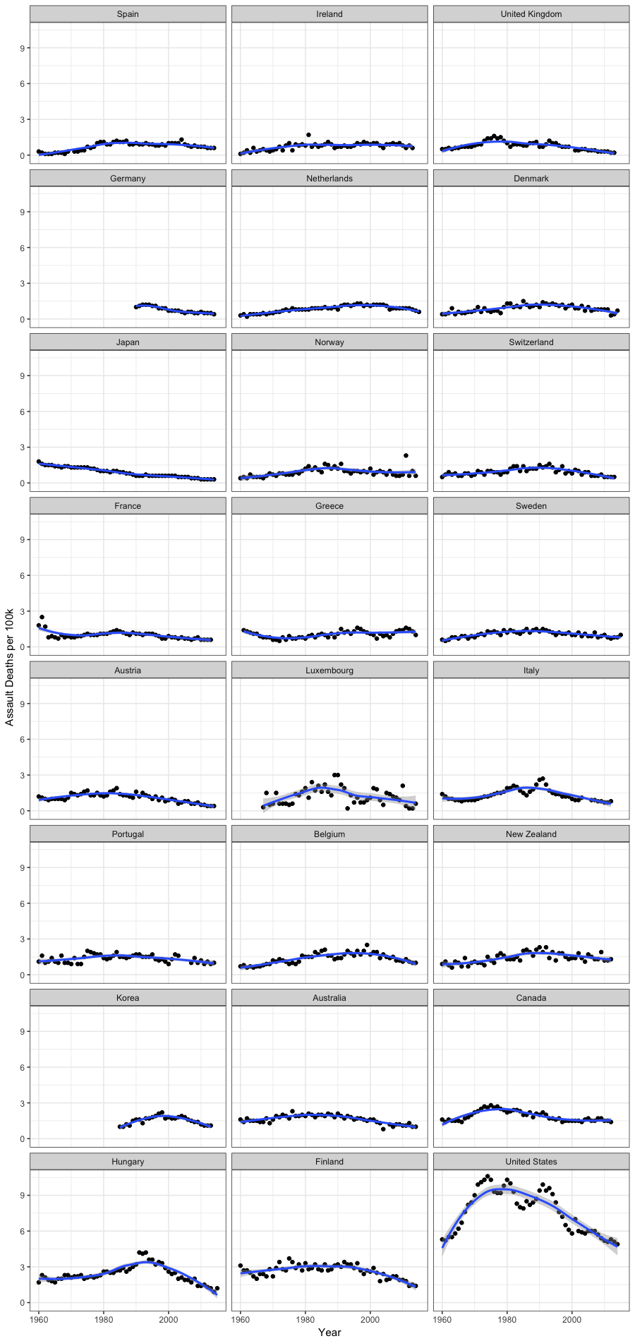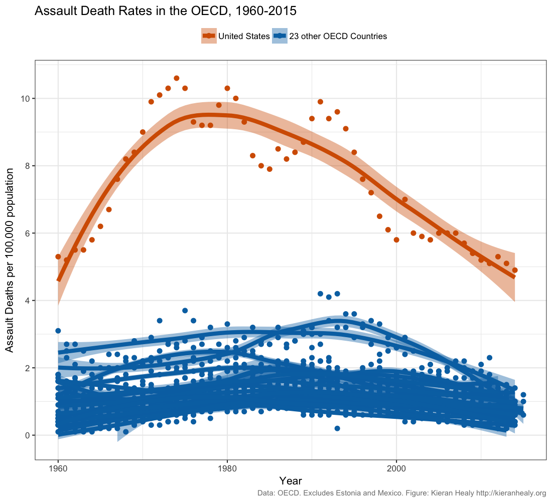 Assault Death rates in the US and other OECD countries, 1960-2015.