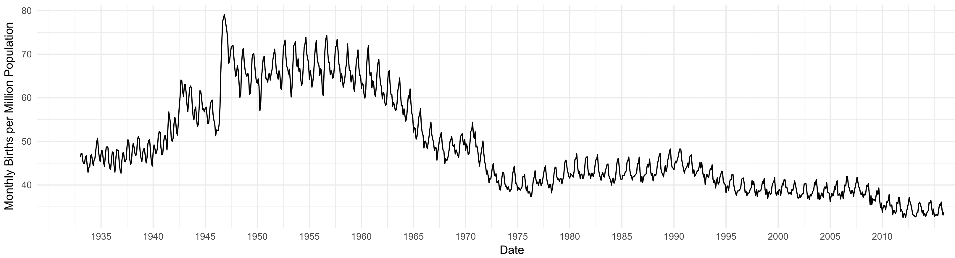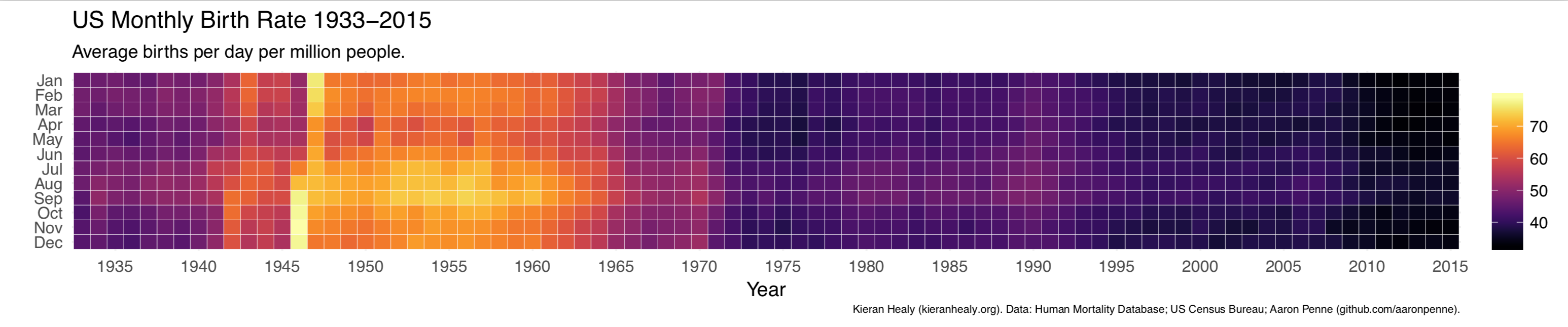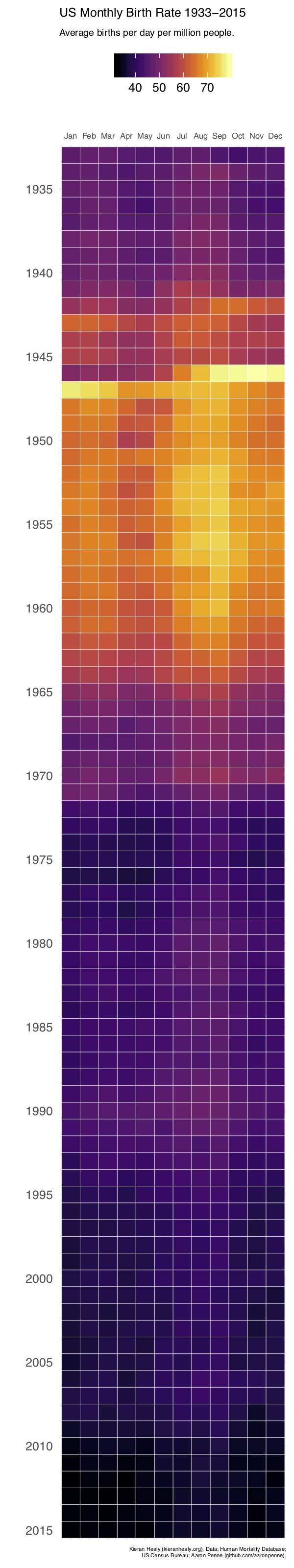Yesterday I came across Aaron Penne’s collection of very nice data visualizations, one of which was of monthly births in the United States since 1933. He made a tiled heatmap of the data, taking care when calculating the average rate to correct for the varying number of days in different months. Aaron works in Python, so I took the opportunity to play around with the data and redo the plots in R. The code and data are on Github.