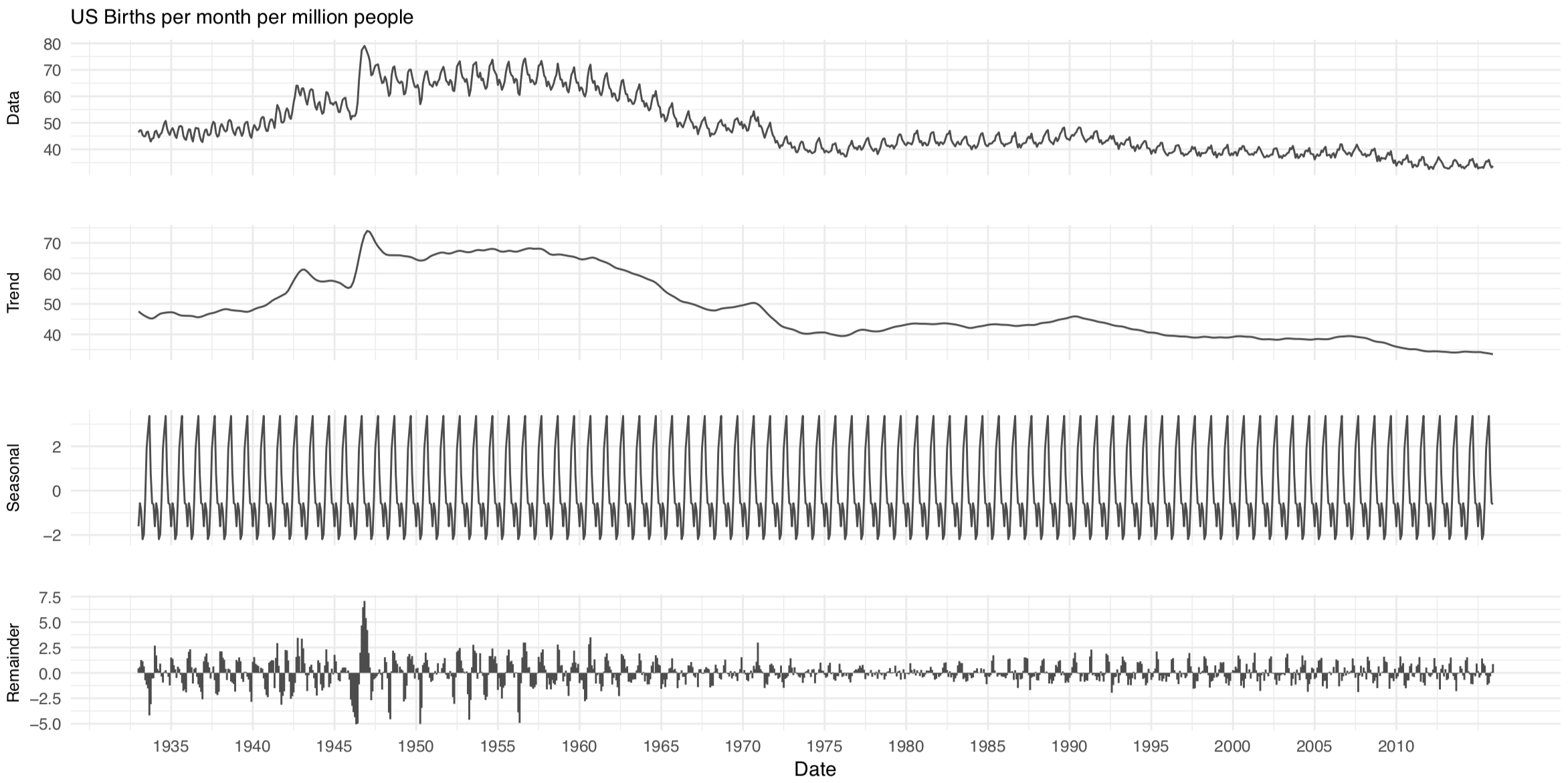 Monthly births in the United Dates, 1933-2015. Time series decomposition.