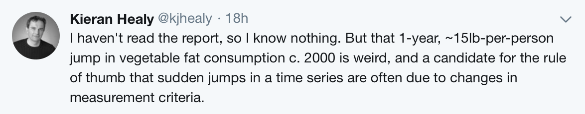 As a rule, when you see a sharp change in a long-running time-series, you should always check to see if some aspect of the data-generating process changed—such as the measurement device or the criteria for inclusion in the dataset—before coming up with any substantive stories about what happened and why. This is especially the case for something susceptible to change over time, but not to extremely rapid fluctuations. A sudden fifteen-pound-per-person-per-year uptick just seems unlikely. And while such shifts are not impossible, of course, you also have to tap the instruments, so to speak, to make sure everything’s OK.
