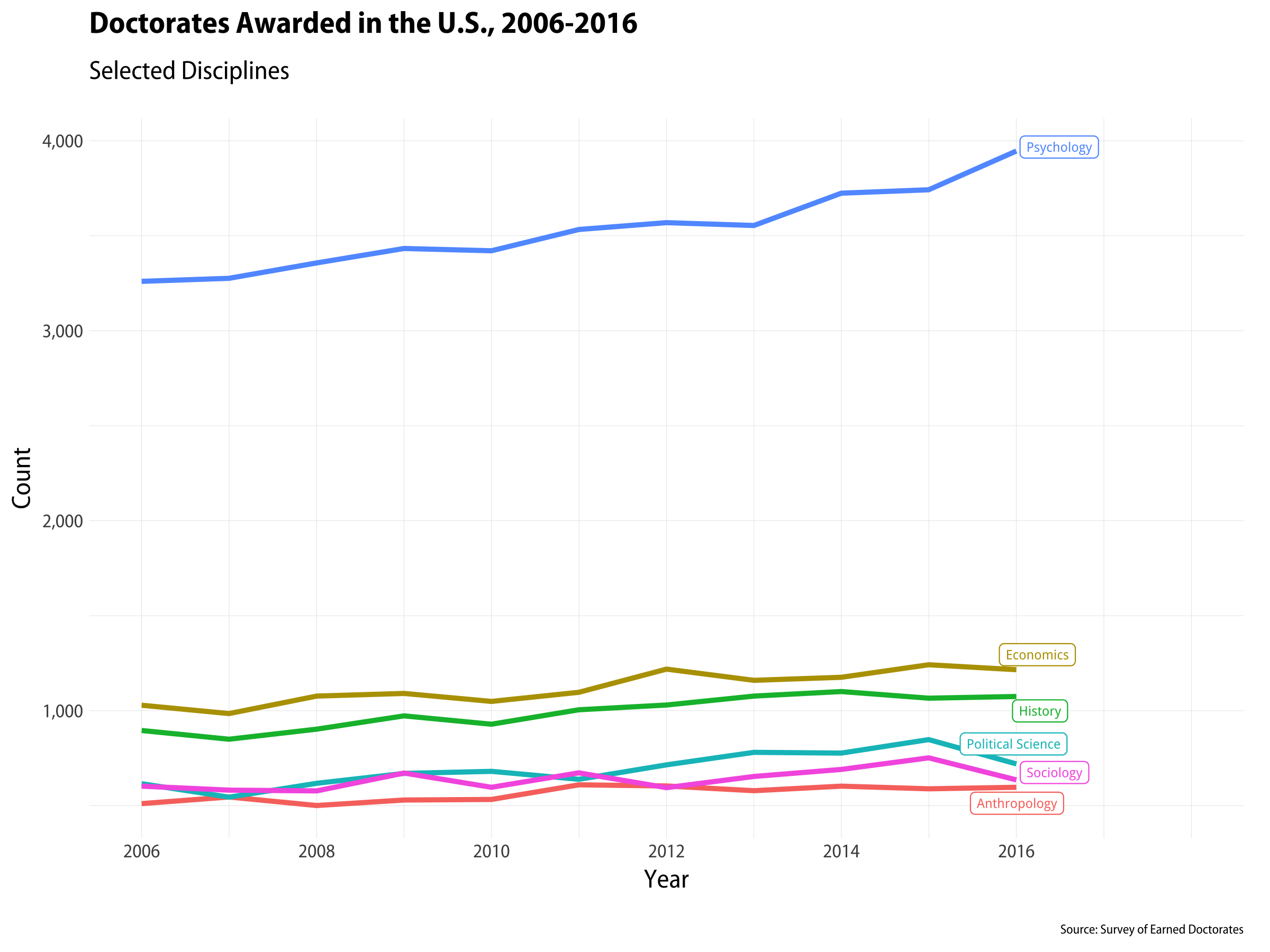 Thierry Rossier asked me for the code to produce plots like the one above. The data come from the Survey of Earned Doctorates, a very useful resource for tracking trends in PhDs awarded in the United States. The plot is made with geom_line() and geom_label_repel(). The trick, if it can be dignified with that term, is to use geom_label_repel() on a subset of the data that contains the last year of observations only. That way we can label the endpoints in a nice way, which I think is often preferable to a key or legend that the reader has to refer to in order to decode the graph. The gghighlight package (https://github.com/yutannihilation/gghighlight) will do this for you in a single step. But this works, too.