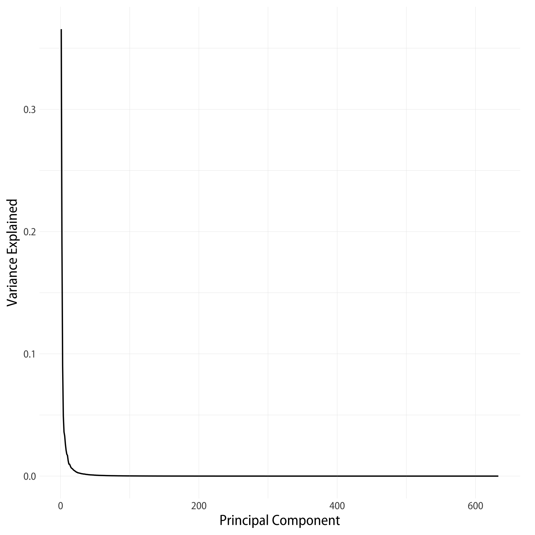 matrix, and then revert the centering and scaling steps. If we multiply by the transpose of the full rotation matrix (and then un-center and un-scale), we’ll recover the original data matrix exactly. But we can also choose to use just the first few principal components, instead. There are 633 components in all (corresponding to the number of rows in the original data matrix), but the scree plot suggests that most of the data is “explained” by a much smaller number of components than that.