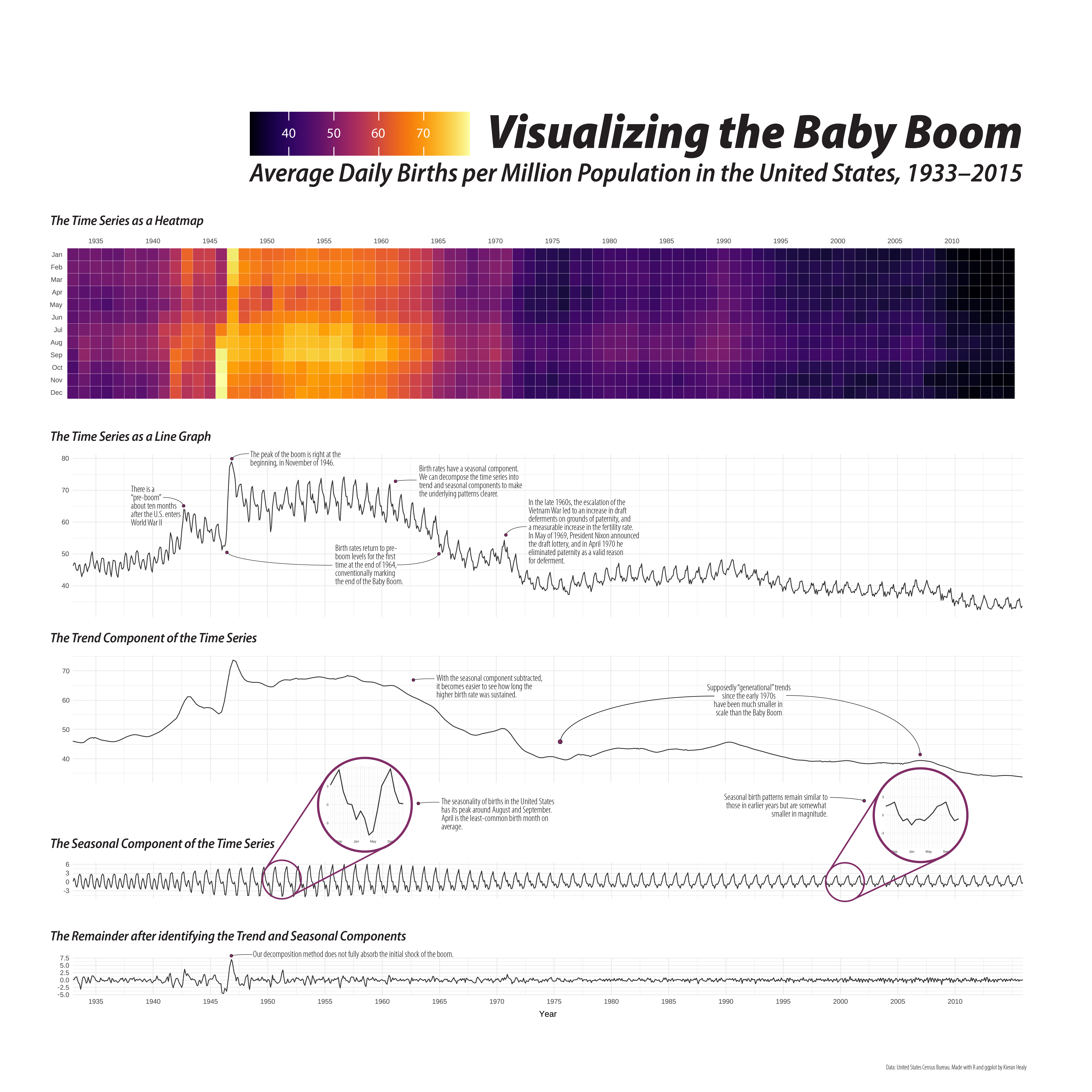 I wanted to work through a few examples of more polished graphics done mostly but perhaps not entirely in R. So, I revisited the Baby Boom visualizations I made a while ago and made a new poster with them. This allowed me to play around with a few packages that I either hadn’t made use of or that weren’t available the first time around. The most notable additions are Rob Hyndman’s suite of tidy tools for time series analysis and Thomas Lin Pedersen’s packages ggforce and patchwork. These are all fantastic resources. The time series decomposition was done with the tsibble family of tools. Meanwhile ggforce and patchwork allow for a tremendous degree of flexibility in laying out multiple plots while still being very straightforward to use. Here’s a preview of the result: