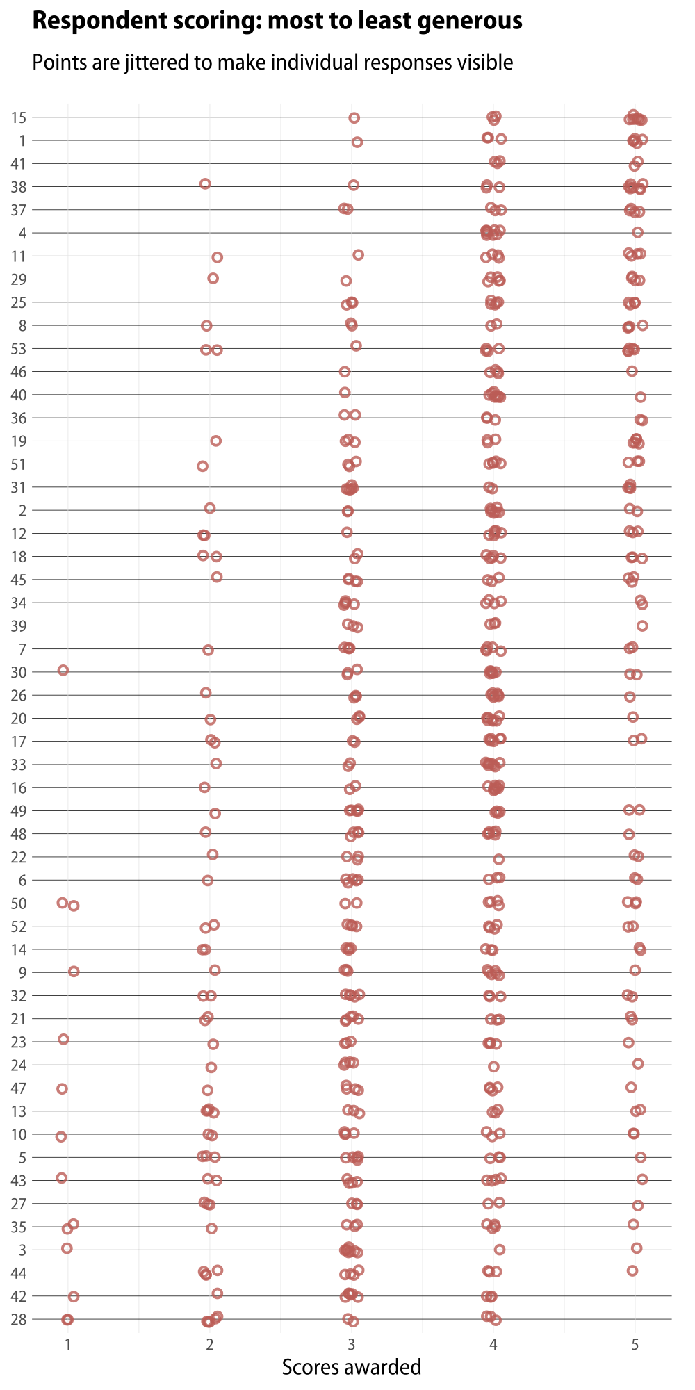 Next, what about variation across respondents? There are at least two sources of variability here. First, people have different opinions. Second, net of their opinions some people are just tougher graders than others. We could draw a similar graph to the one above with a panel for each respondent, but with more than fifty of them things get a little crowded. A second possibility is to put each respondent on the y-axis (again ranked from most to least generous on average) and show each of their scores on the x-axis. Here’s what that looks like.