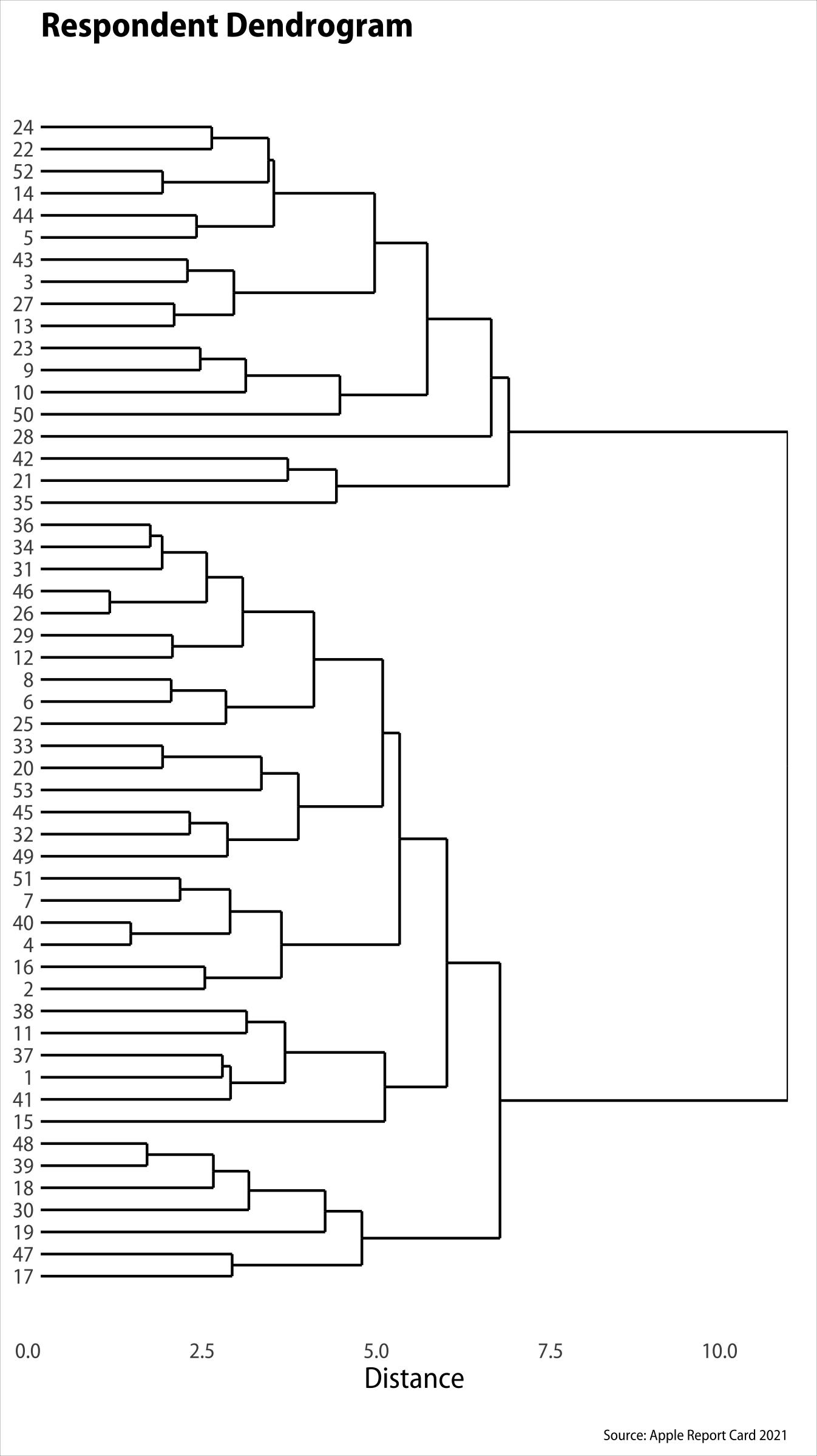 Here the scale runs from orange (bad, 1) to green (best, 5) through gray (average, 3). Missing values are shown in white. I might have used black but I wanted to keep that to outline the groups implied by cutting the dendrogram at a height of about 6. This gives us five notional groups, including #28 in a group all by themselves. The grouping isn’t especially strong. But as I say it’s tempting to see the group at the top as being where the active software developers are clustered along with people who are trying to get the most out of Apple TV and Homekit automation (and hating it). This group is also, on the whole, less positive than average about Apple’s other devices and services. Meanwhile at the bottom are generally contented end-users who are still happy to have gotten a new remote control, and are annoyed at Apple mostly for its performance on broader societal topics, such as the environment and labor relations.