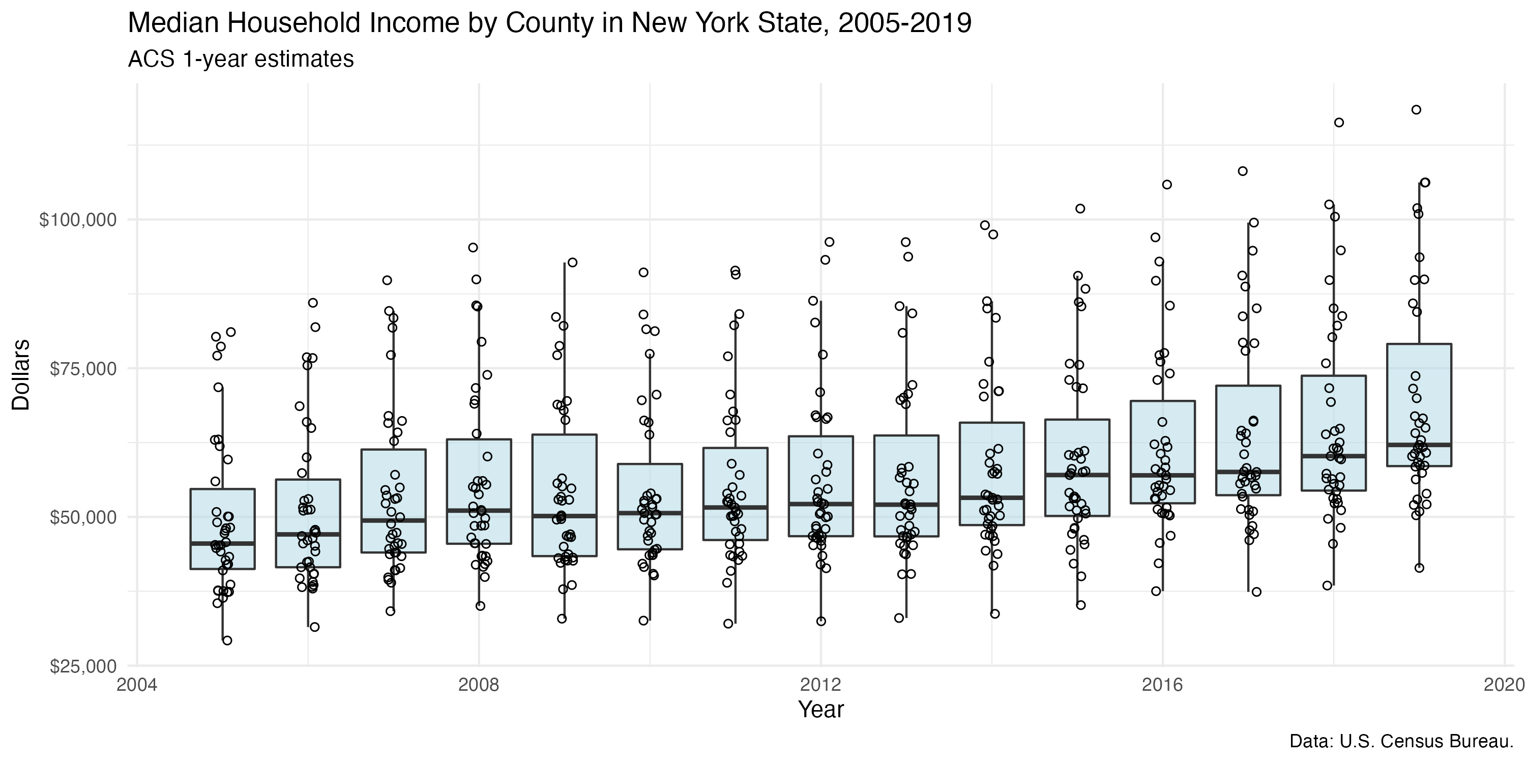 ## Every county this time.2005:2019%>%set_names()%>%map_dfr(~get_acs(geography="county",variables="B19013_001",state="NY",survey="acs1",year=.x),.id="year")%>%mutate(year=as.integer(year))%>%ggplot(mapping=aes(x=year,y=estimate,group=year))+geom_boxplot(fill="lightblue",alpha=0.5,outlier.alpha=0)+geom_jitter(position=position_jitter(width=0.1),shape=1)+scale_y_continuous(labels=scales::label_dollar())+labs(x="Year",y="Dollars",title="Median Household Income by County in New York State, 2005-2019",subtitle="ACS 1-year estimates",caption="Data: U.S. Census Bureau.")+theme_minimal()