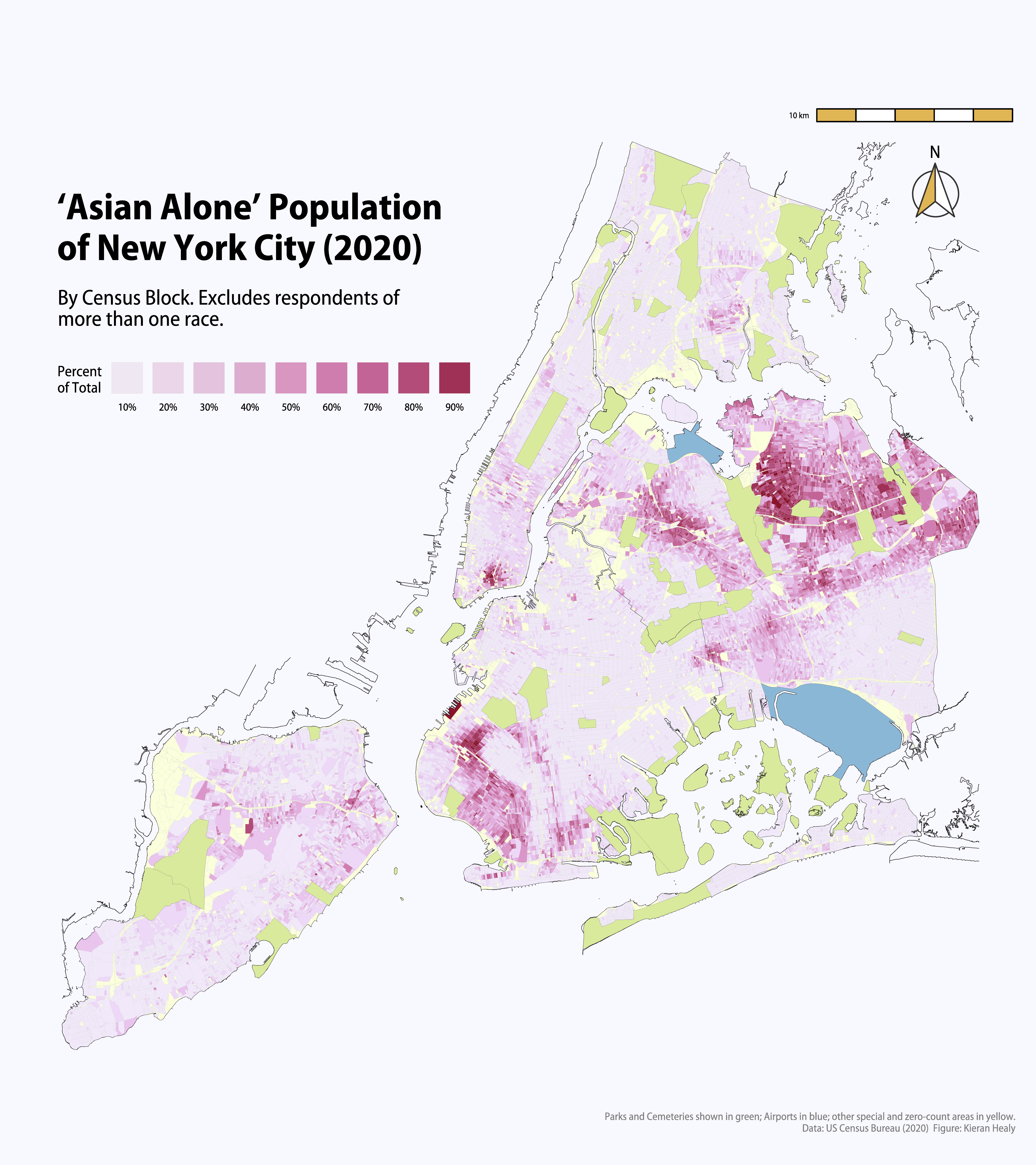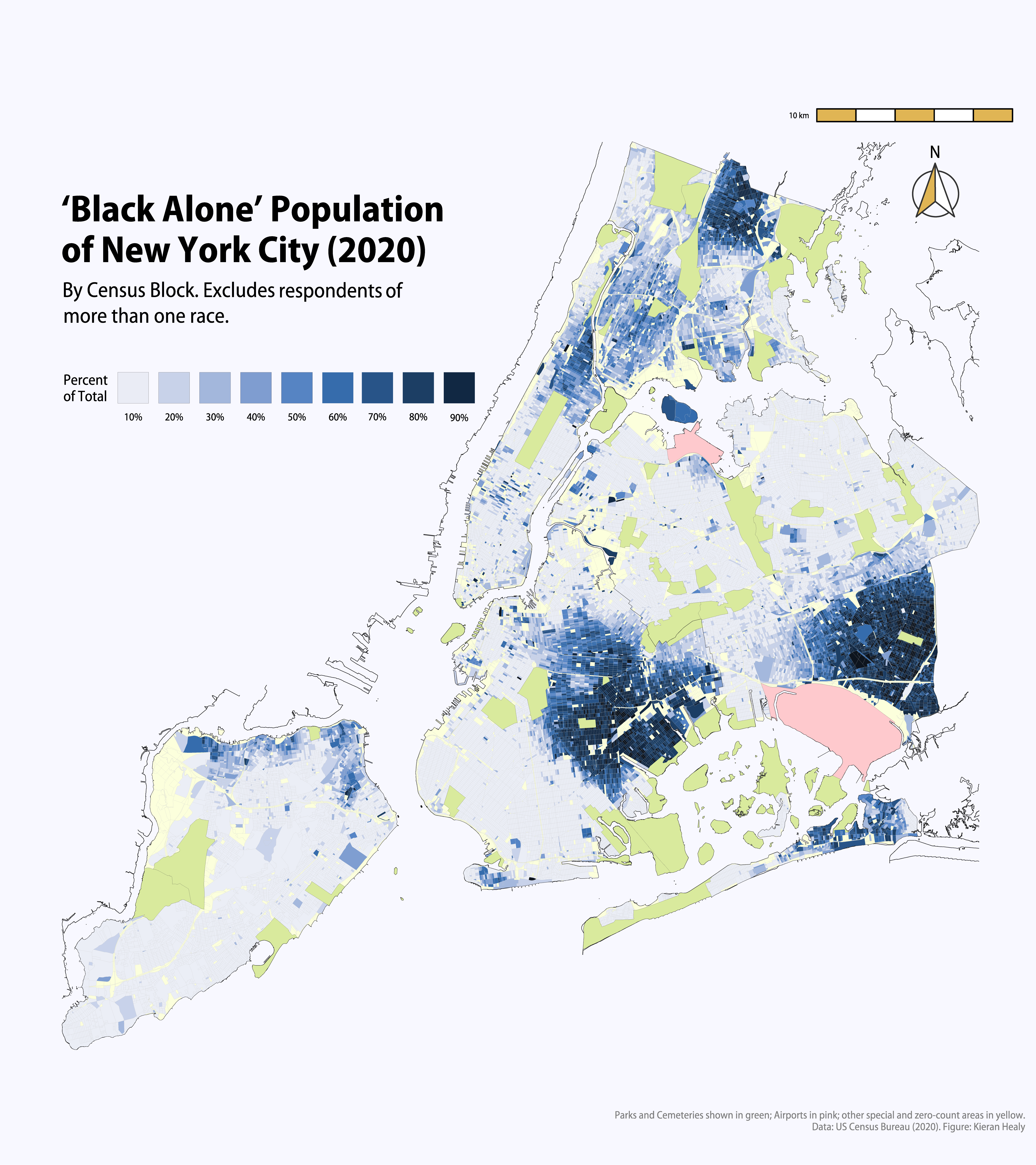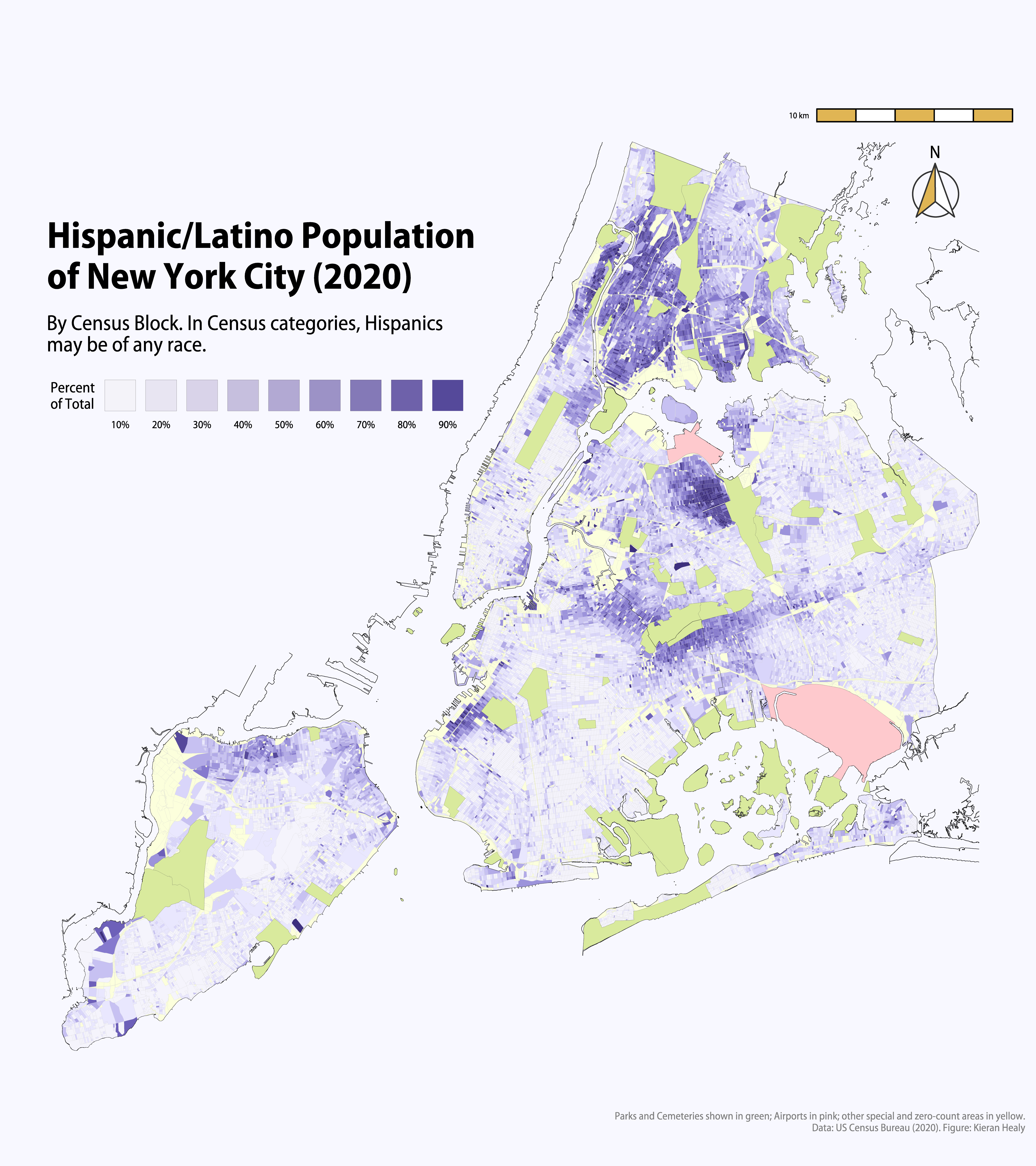 I’m about to start work on a second edition of my Data Visualization book. As a result I continue to mess around with stuff I’m considering including in a new edition. The other day I pulled some block-level Census data and drew a map of the distribution of people of color in New York City, which is to say the share of the population that reports being something other than Non-Hispanic White. I’ve polished that map a little more and drawn some additional ones. As before, the main substantive issues to bear in mind are (a) how the Census measures and classifies race and ethnicity, and (b) the new and I am inclined to think unwise practice of “differential privacy”. The main thing to know about the former is that in the present US Census Bureau schema people of Hispanic or Latino origin may be of any race. (I follow the Census’s nomenclature here, by the way, as it’s their data.) This is the reason that “Non-Hispanic White” is a category for example. The main thing to know about the latter is that it deliberately introduces noise into counts within units where the observed N is small.