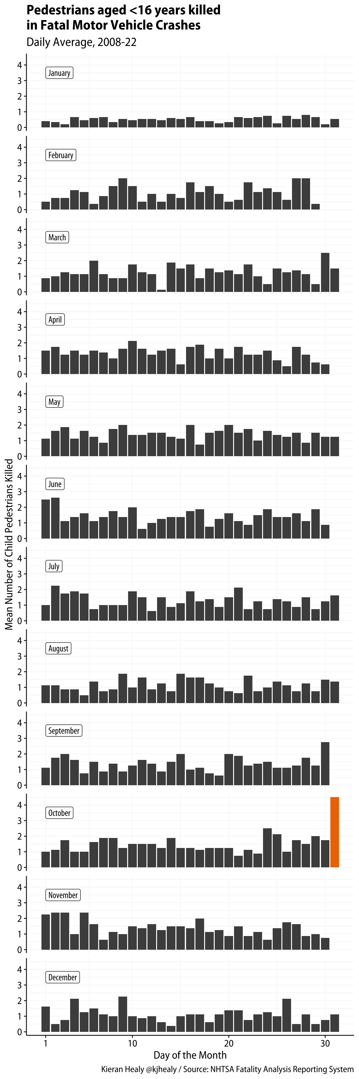 You can see the uptick in pedestrian child fatalities at Halloween pretty clearly in the data. There’s other structure here too, e.g. strong seasonal differences and also upticks on other US holidays. Some patterns in the original data are obscured when we average by day-date rather than day of the week, such as the difference between weekends and other days. Perhaps most important, there’s also an interesting risk-exposure problem here. On the one hand, we see more child fatalities at Halloween. But on the other, we can be pretty confident exposure is also much higher: there are far more children wandering around the street at Halloween than there normally would be. So it may be that the rate with respect to that denominator is the same or lower than “typical” days. But it’s not really possible to have that denominator in data like this. In any case, if you’re out with your children and walking around this Halloween, stay safe. And rather more pertinently, if you’re out driving, be careful.