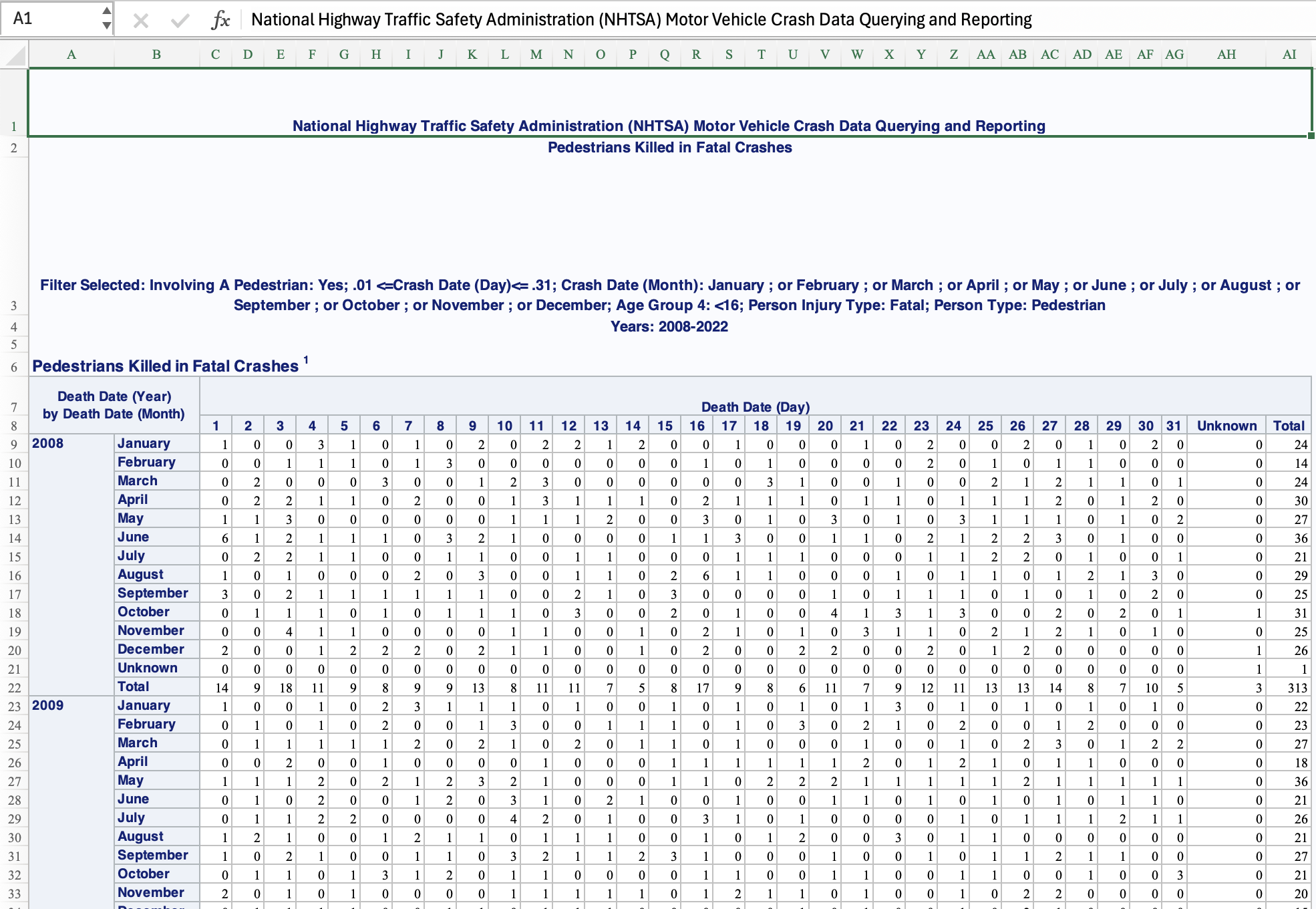 The Excel spreadsheet we get from querying the FARS data with its online report-generating tool.