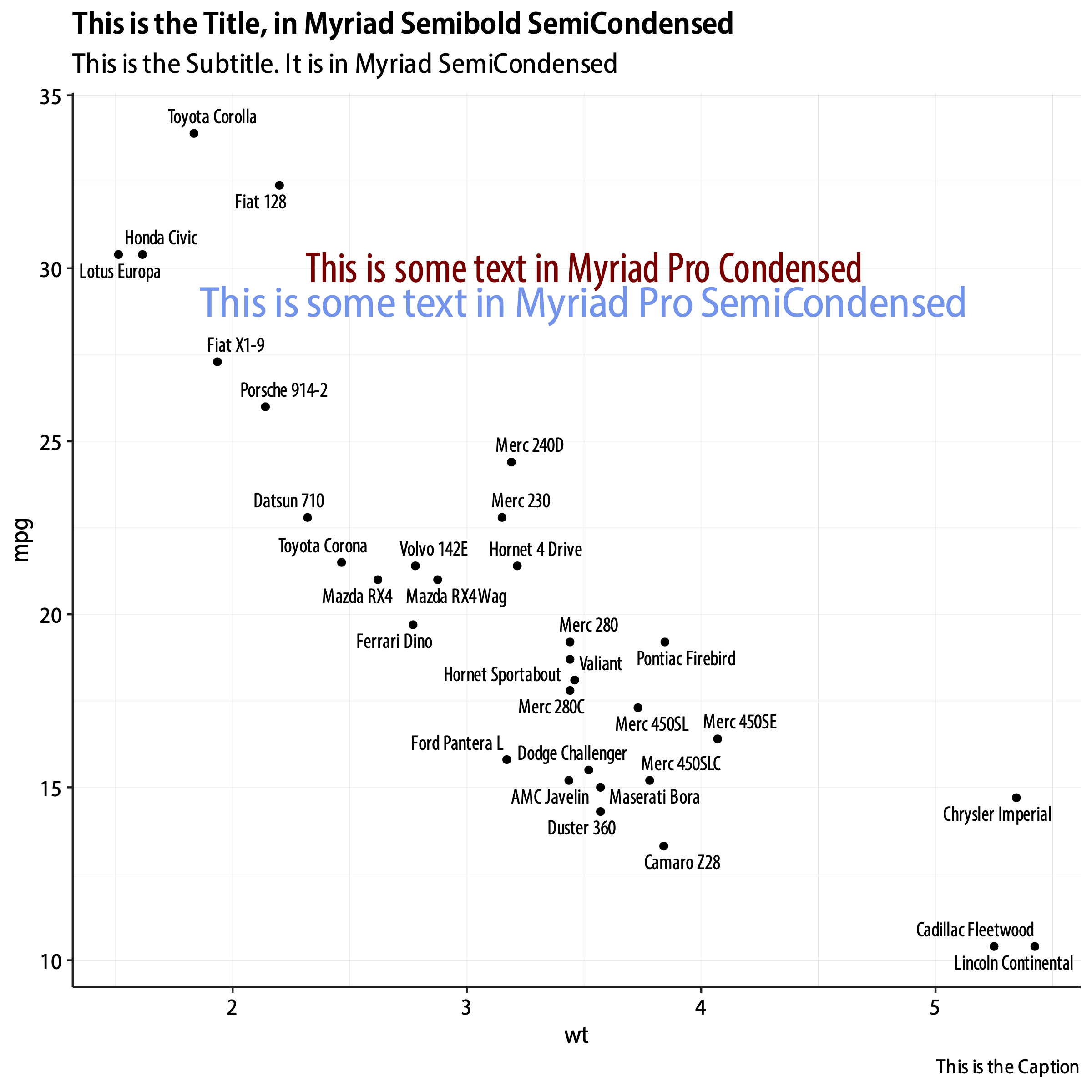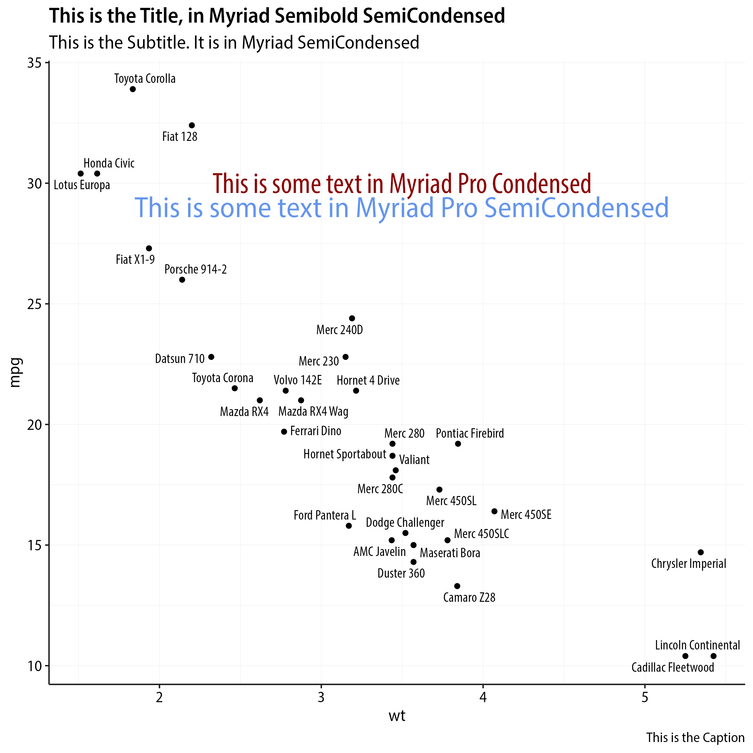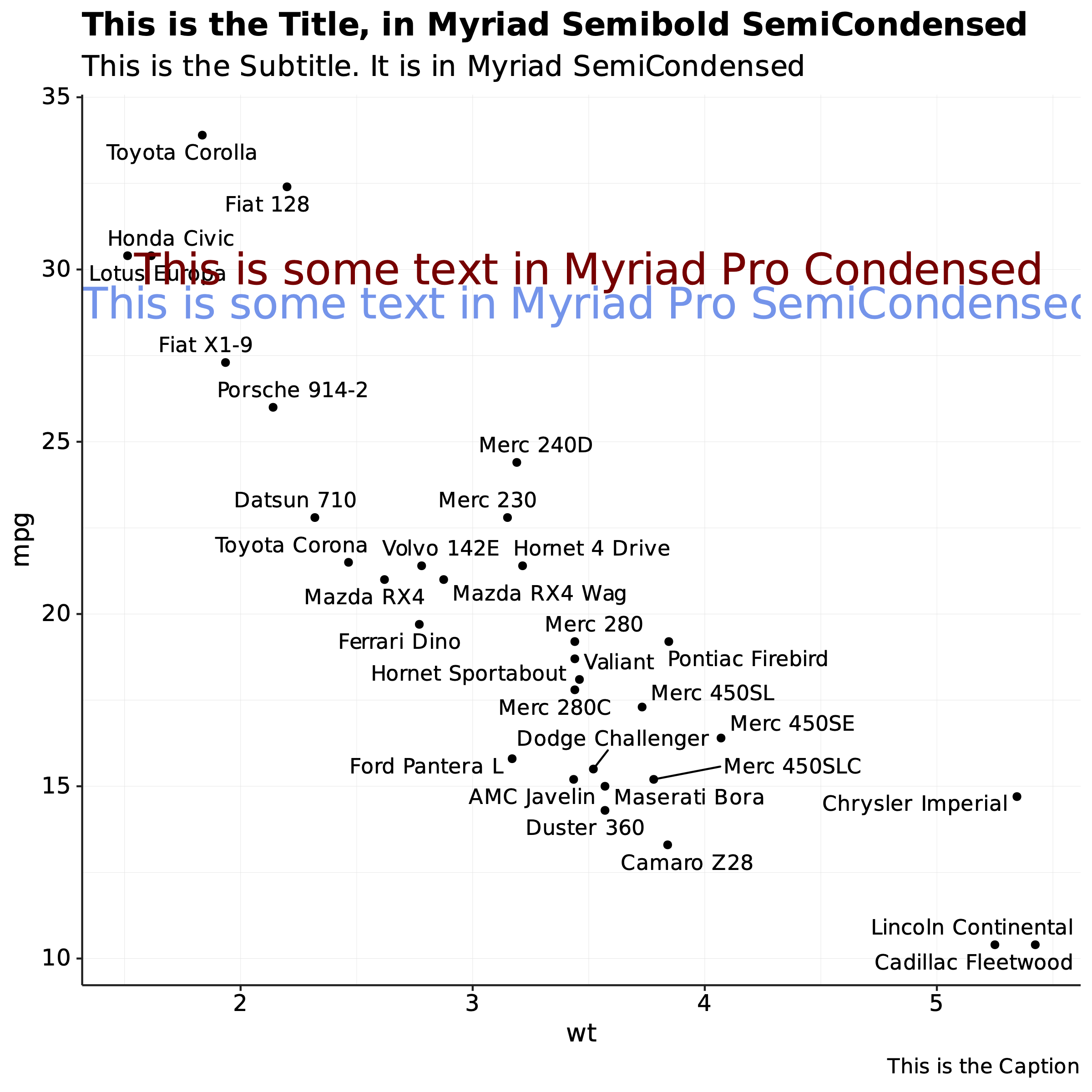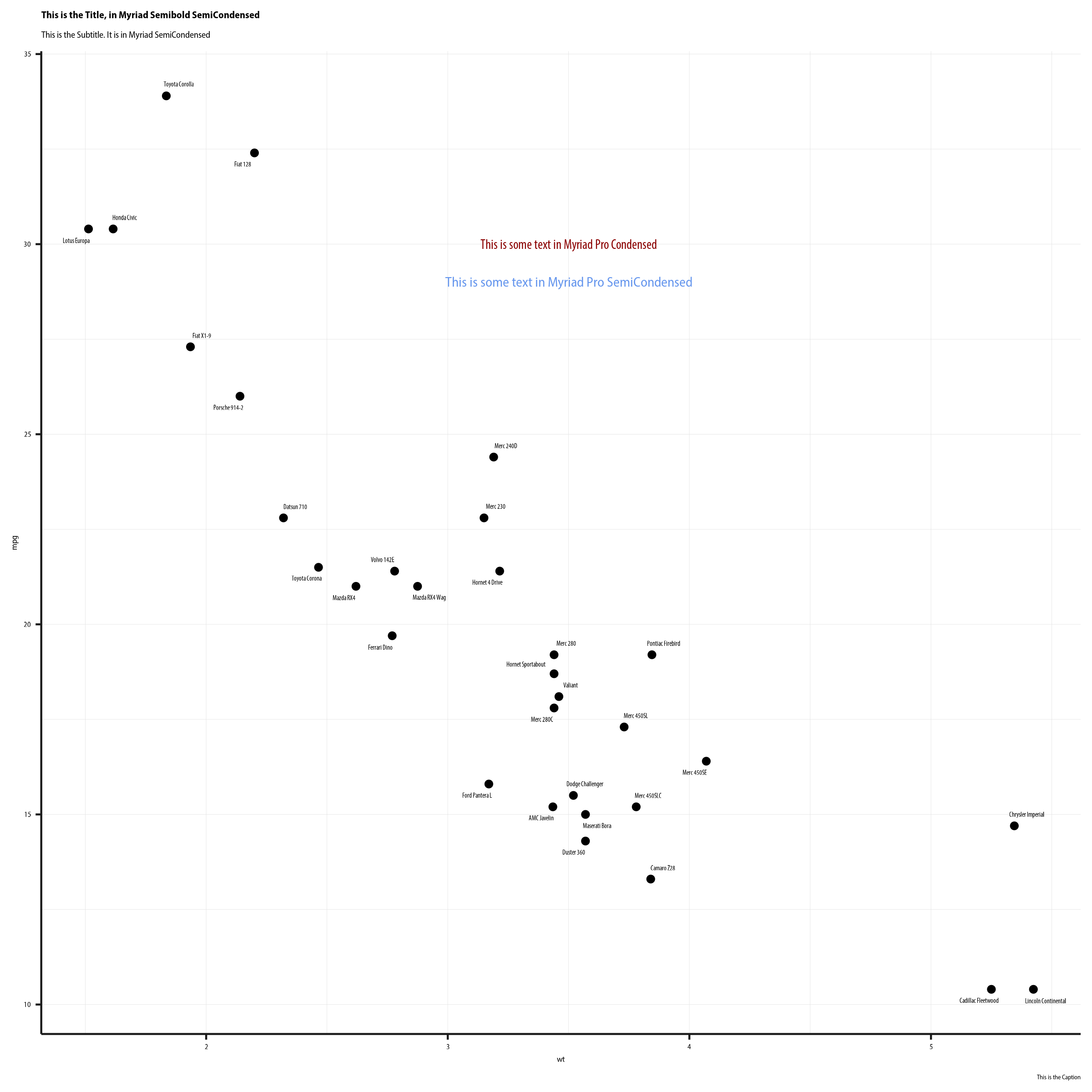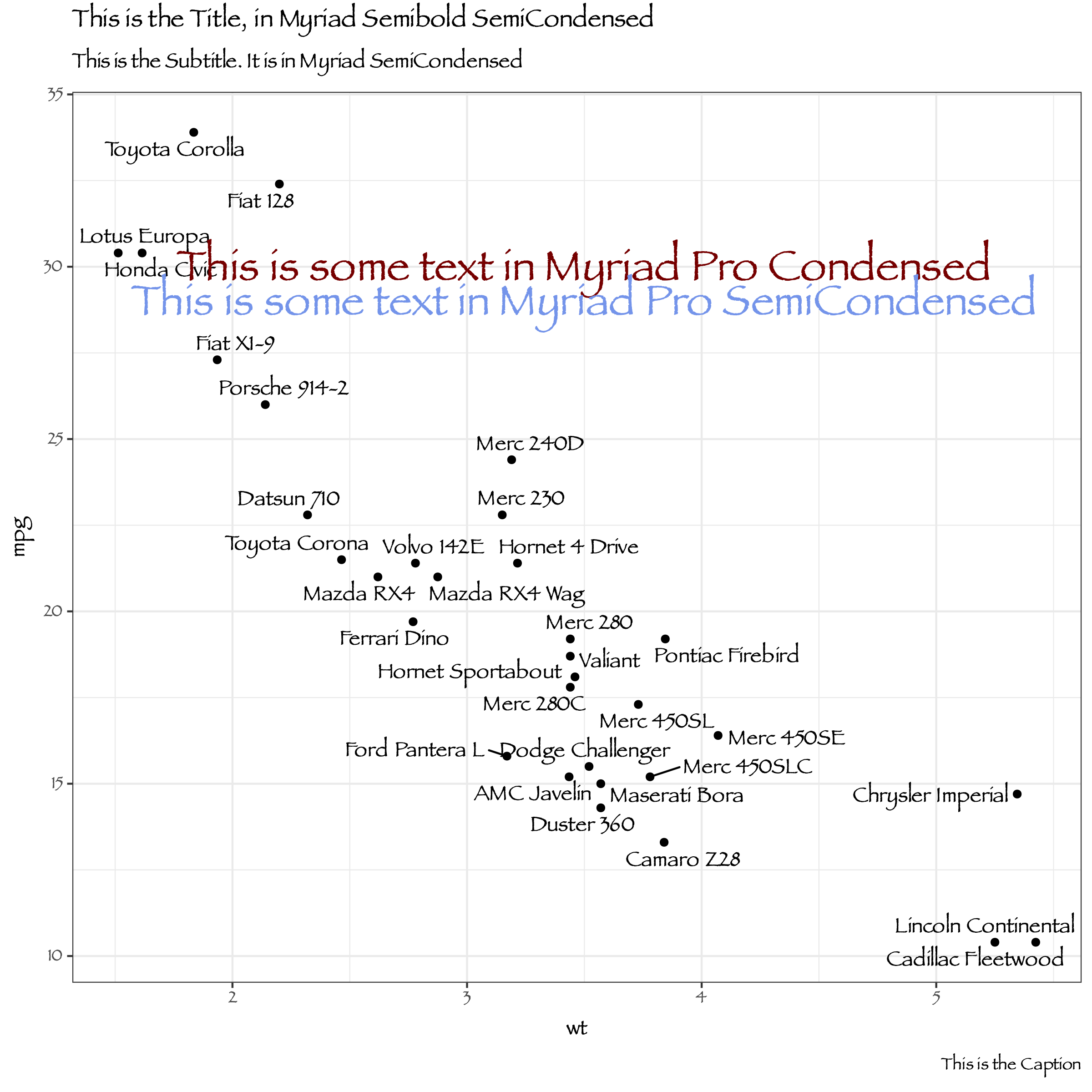 This is the output I want. If all you want to do in life is produce PNGs or JPEGs of ggplot graphs then you are in luck. It works perfectly. Any typeface, any specific font on your system can be used. You live in a paradise created by people like Thomas Lin Pedersen. You do not know how good you have it. You write a bit of code like this: