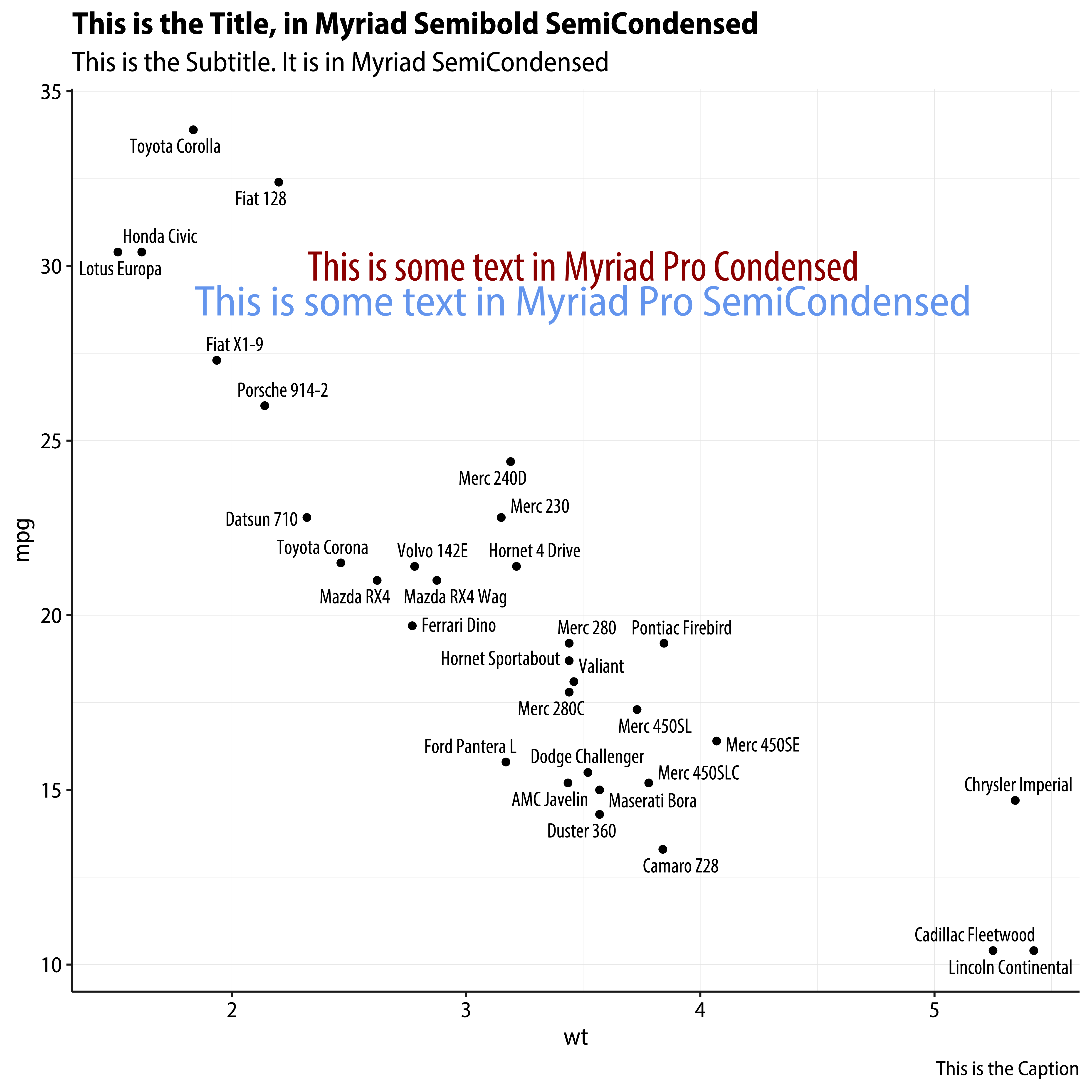 Unfortunately, right now the only way I know to solve this (beyond just forgetting about it and using Papyrus, I mean) is to rewrite the metadata of individual OTF or TTF font files such that they can be installed as a separate font, perhaps with a different name. So you make a “new” font called “Socviz SemiCondensed” for example. You set its Regular face to be Myriad SemiCondensed. You set its bold to be Myriad Semibold SemiCondensed, its italic to be Myriad SemiCondensed Italic, and its Bold Italic to be Myriad Semibold SemiCondensed Italic. Then you save it and install it via FontBook as if it were new. This is essentially what systemfonts::register_variant()