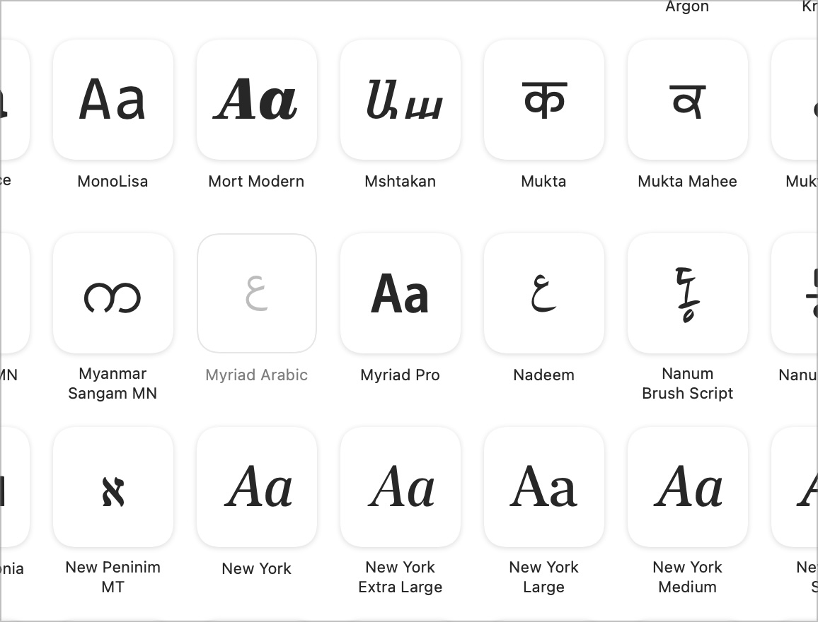 device to see a font like Myriad Semibold SemiCondensed is to have it installed as a separately named family with appropriate regular, bold, italic, and bold italic faces named as such. In the past, fonts would be installed like this more often. Some contemporary font families still are provided this way, with many of the variants provided at the top-level of the system, so to speak. For example, I have loads of variants of Input: