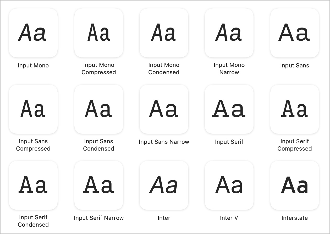 Input Mono, Sans, and Serif, in various Regular, Condensed, and Compressed varities.