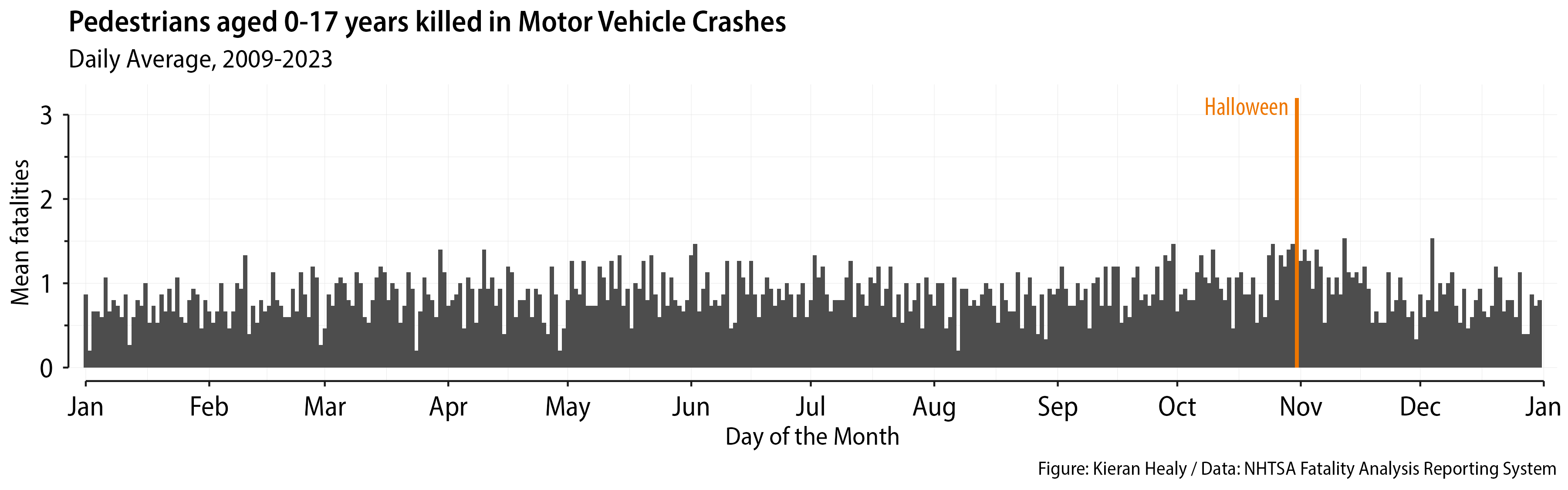PS: One other thing. Remember, as we also noted last year, that any inference about how dangerous Halloween is for child pedestrians shouldn’t depend just on the number of fatalities observed but also on the exposure, which we don’t see directly. There are lots more children—perhaps orders of magnitude more—wandering around on the evening of Halloween than on a typical night, which will change the meaning of the count of pedestrian fatalities.